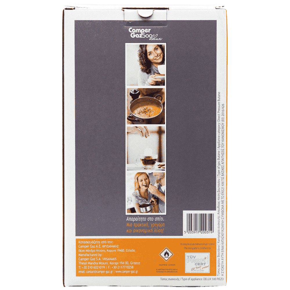 Camper Gaz - Delux 500 Piezo, καμινέτο υγραερίου με αυτόματη ανάφλεξη. Περιλαμβάνει 1 φιαλίδιο υγραερίου βιδωτής βαλβίδας ασφαλείας 500γρ. Η βιδωτή ένωση της συσκευής με το φιαλίδιο προσφέρει σταθερότητα και απόλυτη στεγανοποίηση. Όλα τα προϊόντα της εταιρείας Camper Gaz κατασκευάζονται στην Ελλάδα.