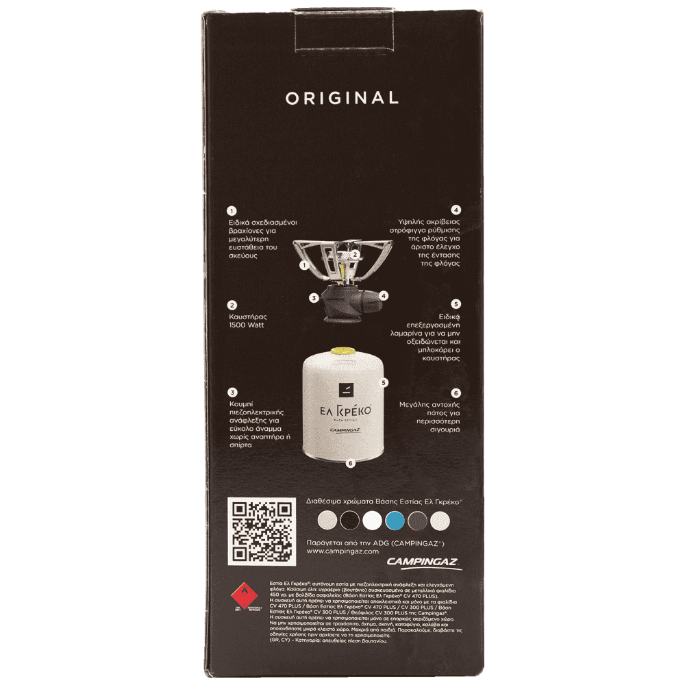 Γκαζάκι για μπρίκι. Η φιάλη περιέχει 450gr βουτανίου. Ισχύς 1500 watt. Κατανάλωση υγραερίου: 108γρ./ώρα Λειτουργεί αποκλειστικά με τα φιαλίδια Ελ Γκρέκο? CV 470 της Campingaz Εύκολο σύστημα σύνδεσης.