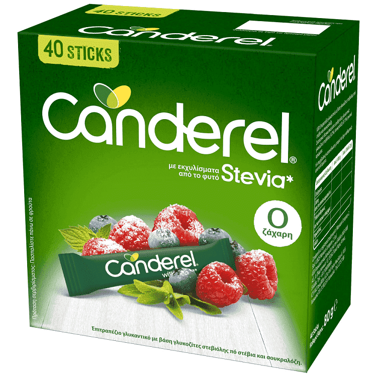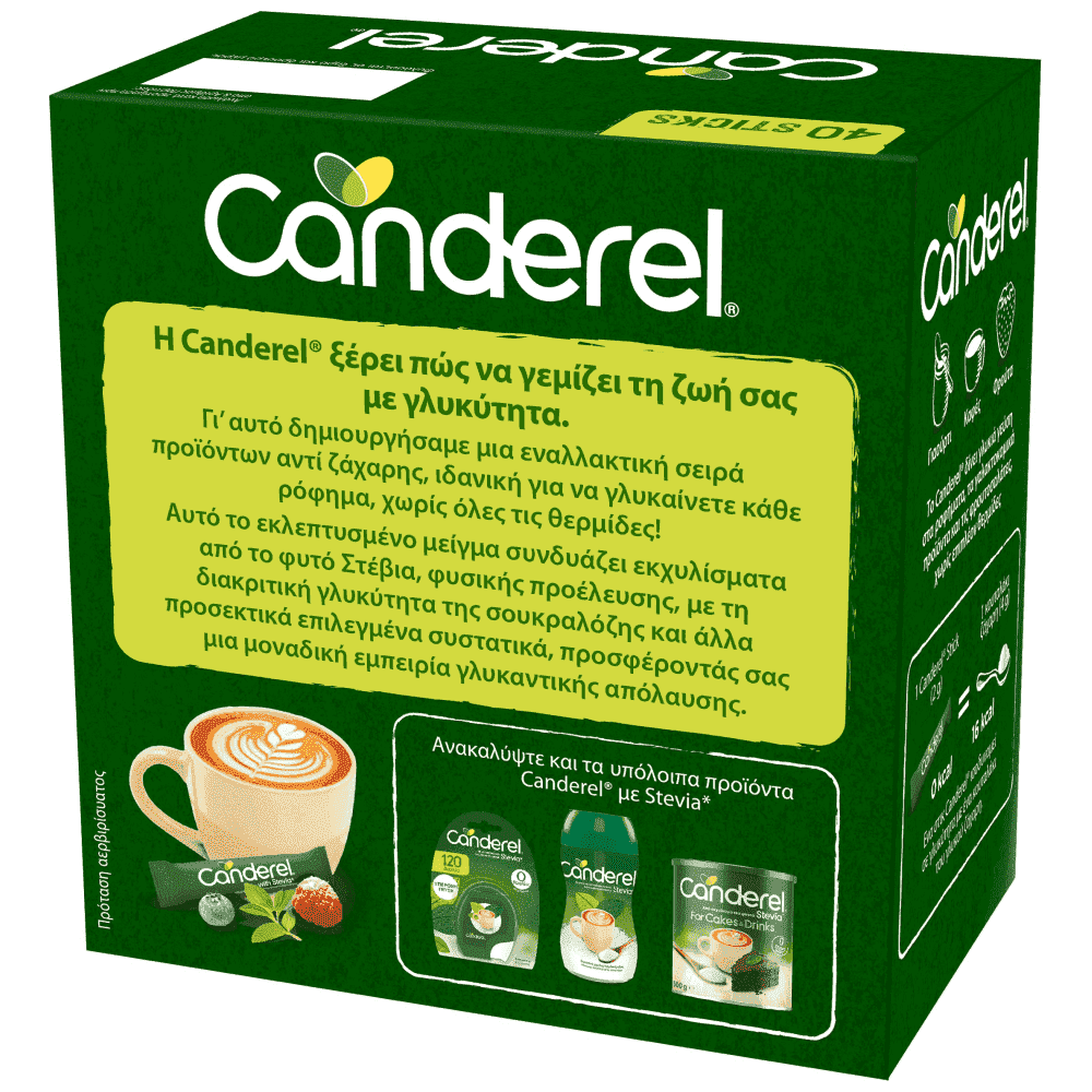 Εύκολο στην χρήση με ιδανική δόση το Canderel sticks είναι εύκολο να το μεταφέρεται παντού μαζί σας. Ιδανικό για ποτά και για πασπάλισμα στα φρούτα, στα δημητριακά και στο γιαούρτι σας με δέκα φορές λιγότερες θερμίδες από την ζάχαρη.
