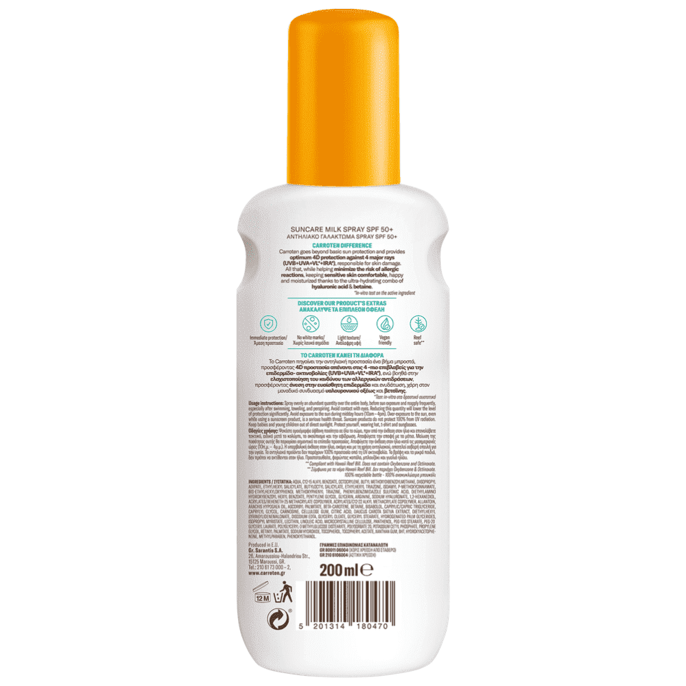 Aqua, Homosalate, Octocrylene, C12-15 Alkyl Benzoate, Ethylhexyl Salicylate, Butyl Methoxydibenzoylmethane, Butyloctyl Salicylate, Phenylbenzimidazole Sulfonic Acid, Bis-Ethylhexyloxyphenol Methoxyphenyl Triazine, Ethylhexyl Triazone, Glycerin, Silica, Potassium Cetyl Phosphate, Butylene Glycol, Undecane, Hydrogenated Palm Glycerides, Arginine, 1,2-Hexanediol, Allantoin, Arachis Hypogaea Oil, Ascorbyl Palmitate, Beta-Carotene, Betaine, Bisabolol, Cannabis Sativa Seed Oil, Caprylyl Glycol, Carnosine, Citric Acid, Daucus Carota Sativa Extract, Glyceryl Oleate, Glyceryl Stearate, Isopropyl Myristate, Lecithin, Panthenol, Polyacrylate Crosspolymer-6, Sodium Cetearyl Sulfate, Sodium Chloride, Sodium Hydroxide, Sodium Sulfate, t-Butyl Alcohol, Tetrasodium EDTA, Tocopherol, Tocopheryl Acetate, Triacontanyl PVP, Tridecane, Xanthan Gum, BHT, Hydroxyacetophenone.