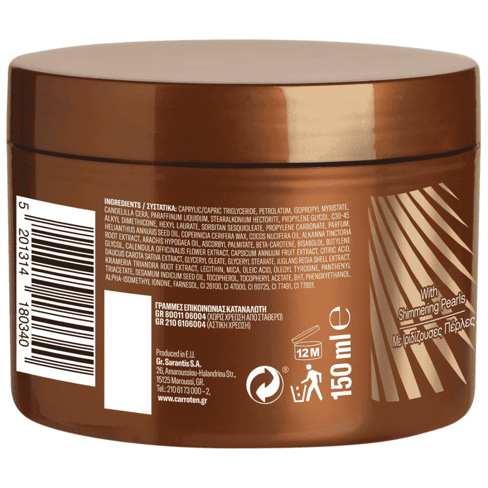 Το απόλυτο καλοκαιρινό χρώμα; Carroten Gold Gel για πολύ έντονο μαύρισμα! Προσδίδει μοναδικό και ταχύ αποτέλεσμα, χάρη στον ειδικά μελετημένο συνδυασμό πλούσιων λαδιών μαυρίσματος. Παράλληλα, βοηθά στην ενυδάτωση της επιδερμίδας, προστατεύοντάς τη από το ξεφλούδισμα, με το λάδι σουσαμιού και το εκχύλισμα καλέντουλας. Οι πέρλες λάμψης φωτίζουν την επιδερμίδα, χαρίζοντάς της έναν όμορφο χρυσαφένιο, φυσικό τόνο.