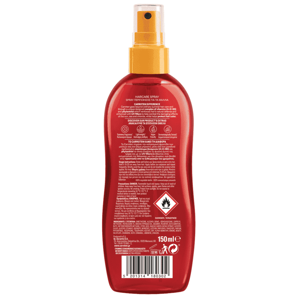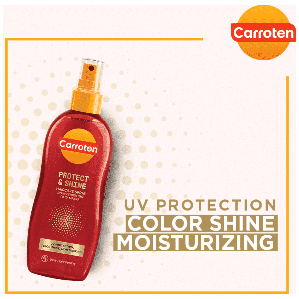 Το σπρέι περιποίησης μαλλιών, Carroten Protect & Shine, ενισχύει τη φυσική άμυνα της τρίχας, προστατεύοντάς τη από τις οξειδώσεις που δημιουργούν οι περιβαλλοντικοί παράγοντες, κατά τη διάρκεια των καλοκαιρινών μηνών. Παράλληλα, προστατεύει τα μαλλιά από τη UV ακτινοβολία, από τη θάλασσα και το χλώριο, χαρίζοντας εξαιρετικά απαλά και ανάλαφρα μαλλιά.