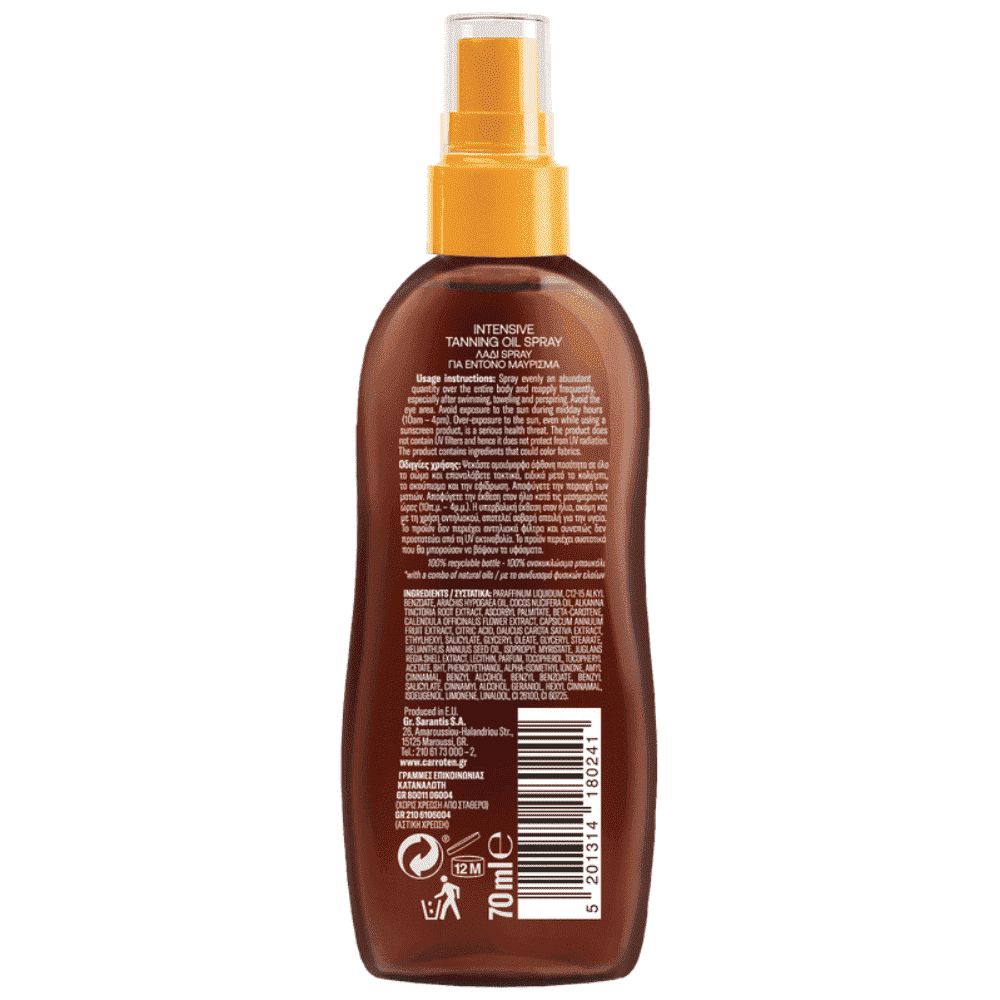 Το απόλυτα διαχρονικό λάδι Carroten για έντονο μαύρισμα, με το μοναδικό συνδυασμό πλούσιων μαυριστικών ελαίων, προσδίδει γρήγορο και υπέροχο φυσικό μαύρισμα, ενώ παράλληλα θρέφει και ενυδατώνει την επιδερμίδα σε βάθος.