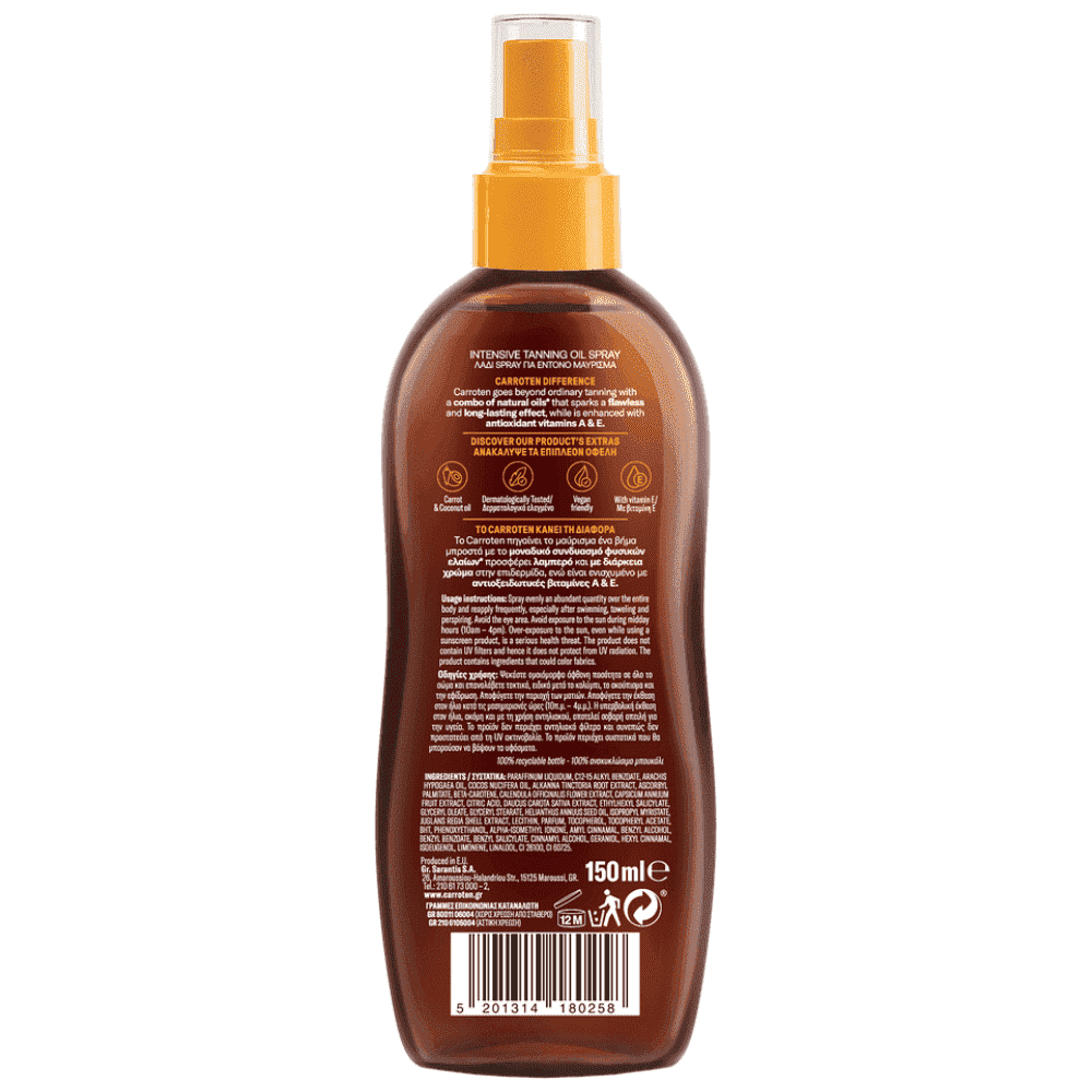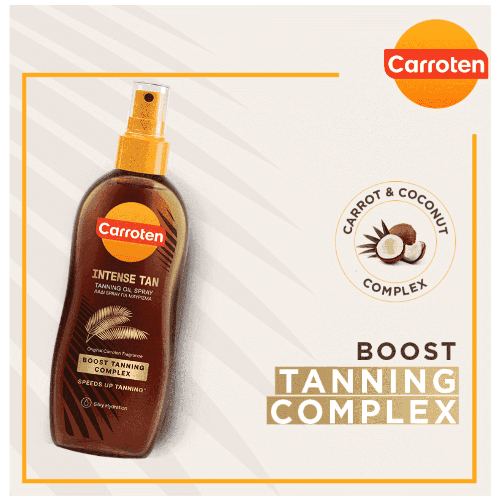 Το απόλυτα διαχρονικό λάδι Carroten για έντονο μαύρισμα, με το μοναδικό συνδυασμό πλούσιων μαυριστικών ελαίων, προσδίδει γρήγορο και υπέροχο φυσικό μαύρισμα, ενώ παράλληλα θρέφει και ενυδατώνει την επιδερμίδα σε βάθος.