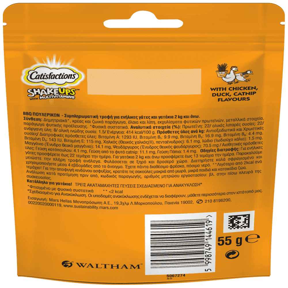 Συμπληρωματική τροφή για ενήλικες γάτες και γατάκια 2 kg και άνω. Για ενήλικες γάτες προσφέρετε έως 22 τεμάχια την ημέρα. Για γατάκια 2 kg και άνω προσφέρετε έως 13 τεμάχια την ημέρα. Παρακαλούμε μειώστε την πλήρη τροφή ανάλογα. Φυλάσσεται σε ξηρό και δροσερό χώρο. Διατηρήστε καλά σφραγισμένο και χρησιμοποιήστε μέσα 4 εβδομάδες από το άνοιγμα. Έχετε πάντα διαθέσιμο φρέσκο, πόσιμο νερό.