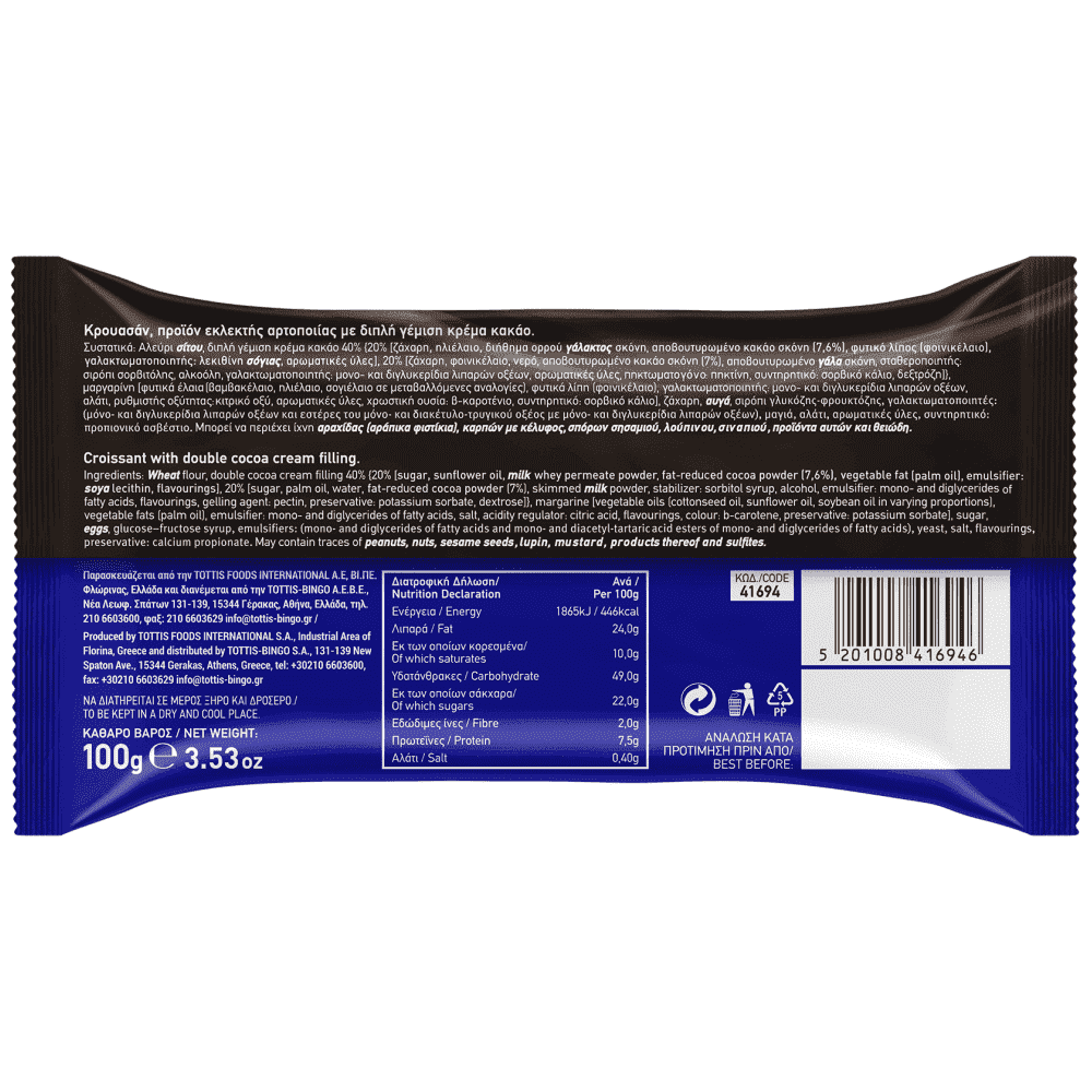 Αλεύρι σίτου (γλουτένη), διπλή γέμιση κρέμα κακάο 40% {20% [ζάχαρη, ηλιέλαιο, διήθημα ορρού γάλακτος σκόνη (λακτόζη), αποβουτυρωμένο κακάο σκόνη (7,6%), φυτικό λίπος (φοινικέλαιο), γαλακτωματοποιητής: λεκιθίνη σόγιας, αρωματικές ύλες], 20% [ζάχαρη, φοινικέλαιο, νερό, αποβουτυρωμένο κακάο σκόνη (7%), αποβουτυρωμένο γάλα σκόνη (λακτόζη), σταθεροποιητής: σιρόπι σορβιτόλης, αλκοόλη, γαλακτωματοποιητής: μόνο και δι-γλυκερίδια λιπαρών οξέων, αρωματικές ύλες, πηκτωματοποιητής: πηκτίνη, συντηρητικό: σορβικό κάλιο, δεξτρόζη]}, μαργαρίνη [φυτικά έλαια (βαμβακέλαιο, ηλιέλαιο, σογιέλαιο σε μεταβαλλόμενες αναλογίες), φυτικά λίπη (φοινικέλαιο), γαλακτωματοποιητής: μονο- και διγλυκερίδια λιπαρών οξέων, αλάτι, ρυθμιστής οξύτητας: κιτρικό οξύ, αρωματικές ύλες, χρωστική ουσία: β-καροτένιο, συντηρητικό: σορβικό κάλιο], ζάχαρη, αυγά, σιρόπι γλυκόζης-φρουκτόζης, υγροσκοπικά μέσα: (γλυκερίνη, σιρόπι σορβιτόλης), κρόκος αυγού, μαγιά, αρωματικές ύλες, γαλακτωματοποιητές: (μόνο- και διγλυκερίδια λιπαρών οξέων και εστέρες του μόνο- και διακέτυλο-τρυγικού οξέος με μόνο- και διγλυκερίδια λιπαρών οξέων), αλάτι, συντηρητικό: προπιονικό ασβέστιο.Αλλεργιογόνα
