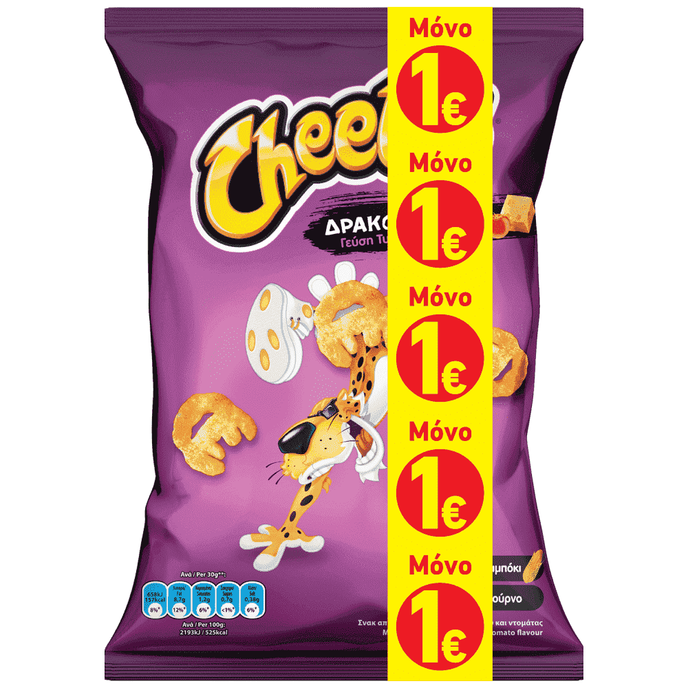 Αραβοσιτάλευρο (60%), αραβοσιτέλαιο, πατατάλευρο, καρύκευμα ντομάτας και τυριού[ορός γάλακτος σε σκόνη(γάλα, λακτόζη), αλάτι, ενισχυτικά γεύσης (όξινο γλουταμινικό νάτριο, γουανιλικό νάτριο, ινοσινικό νάτριο), ζάχαρη, κρεμμύδι σε σκόνη, πάπρικα σε σκόνη (0,44%), χλωριούχο κάλιο, αρωματικές ύλες (γάλα, λακτόζη), ρυθμιστές οξύτητας (άλατα οξικού οξέος με νάτριο, κιτρικό οξύ), ενζυμικά τροποποιημένο τυρί (0,06%) (γάλα, λακτόζη), επεξεργασμένο τυρί σε σκόνη (0,06%) (γάλα, λακτόζη), χρωστικές (ερυθρά χρωστική της ρίζας των τεύτλων, μπετανίνη, εκχύλισμα πάπρικας), πιπεριά τσίλι σε σκόνη, ντομάτα σε σκόνη (0,03%)], σιτάλευρο, ρυζάλευρο, μαλτοδεξτρίνη, κόκκοι λευκού καλαμποκιού, δεξτρίνη, αρωματικές ύλες, χρωστική(εκχύλισμα πάπρικας). Πιθανόν να περιέχει άλλα δημητριακά που περιέχουν γλουτένη και σόγια.