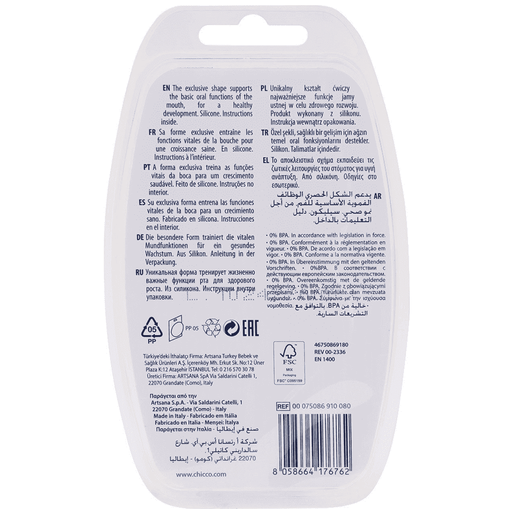 Η ανατομική και λειτουργική πιπίλα Chicco PhysioForma μπορεί να διαδραματίσει κρίσιμο ρόλο σε αυτή τη δυναμική: έχει θετική επίδραση στην ανάπτυξη του στόματος και των λειτουργιών του, καθώς επιτρέπει τη σωστή θέση της γλώσσας και συνεπώς εγγυάται την αρμονική ανάπτυξη του ουρανίσκου και τη σωστή και βαθιά διέγερσή του.