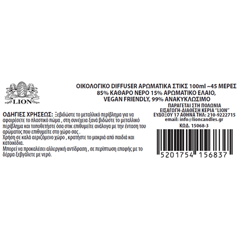 85% καθαρό νερό , 15% αρωαμτικό έλαιο , vegan friendly,