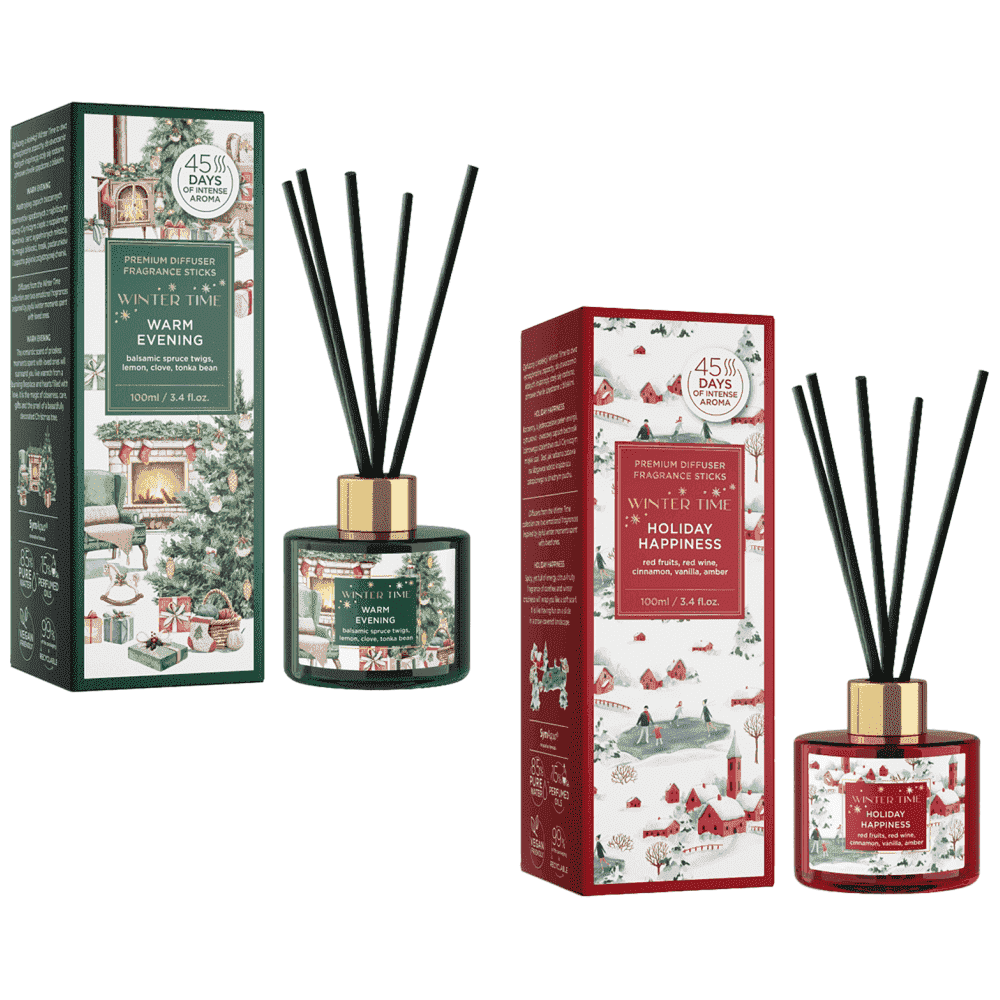 Τα αρωαμτικά στικς diffusers Winter Time είναι δύο Χριστουγεννιάτικα αρώματα εμπνευσμένα από χαρούμενες χειμωνιάτικες στιγμές που περνάμε με αγαπημένα μας πρόσωπα.Αρώματα με νότες από πορτοκάλι, ευκάλυπτο πεύκο,γαρίφαλο , κανέλα, βανίλια, τόνκα