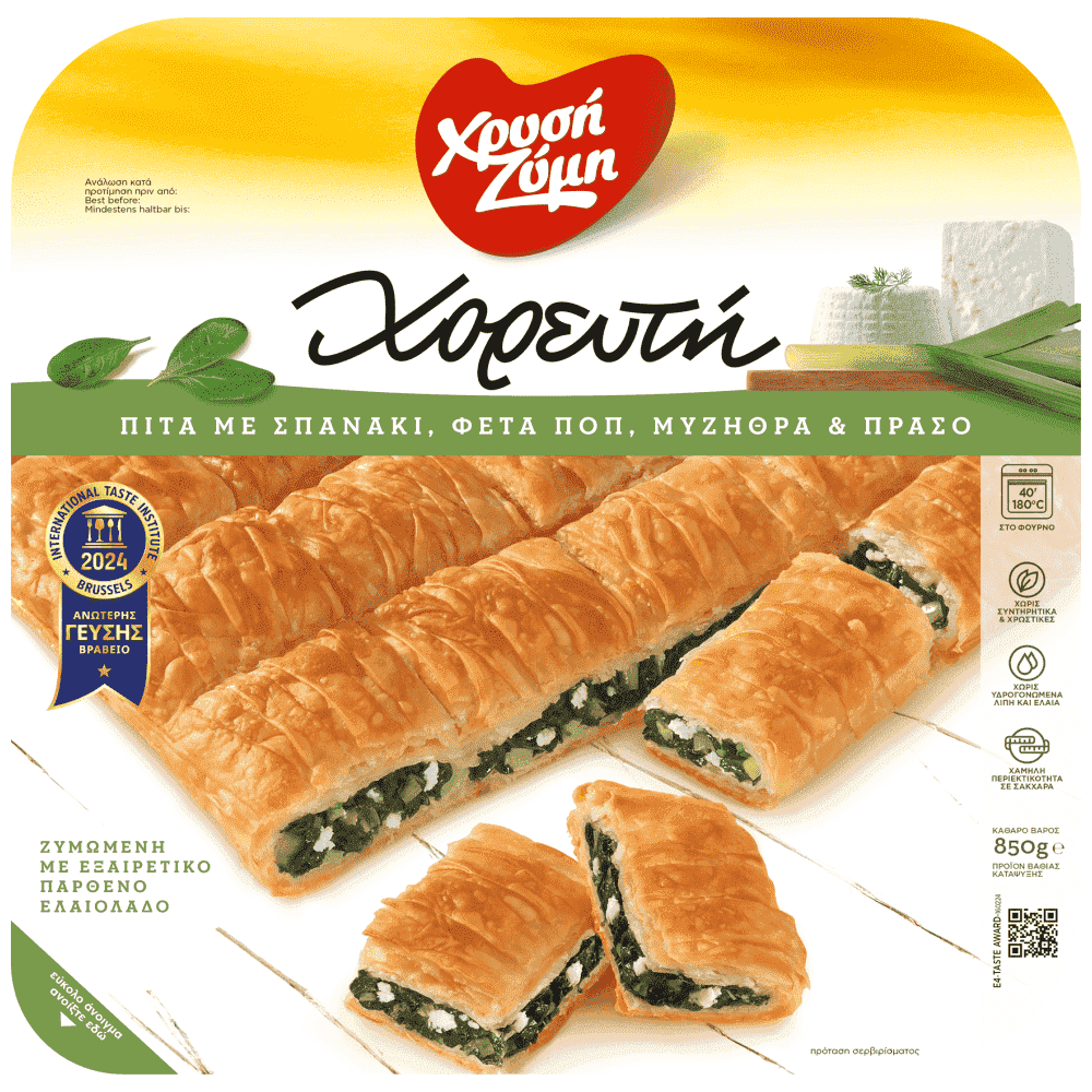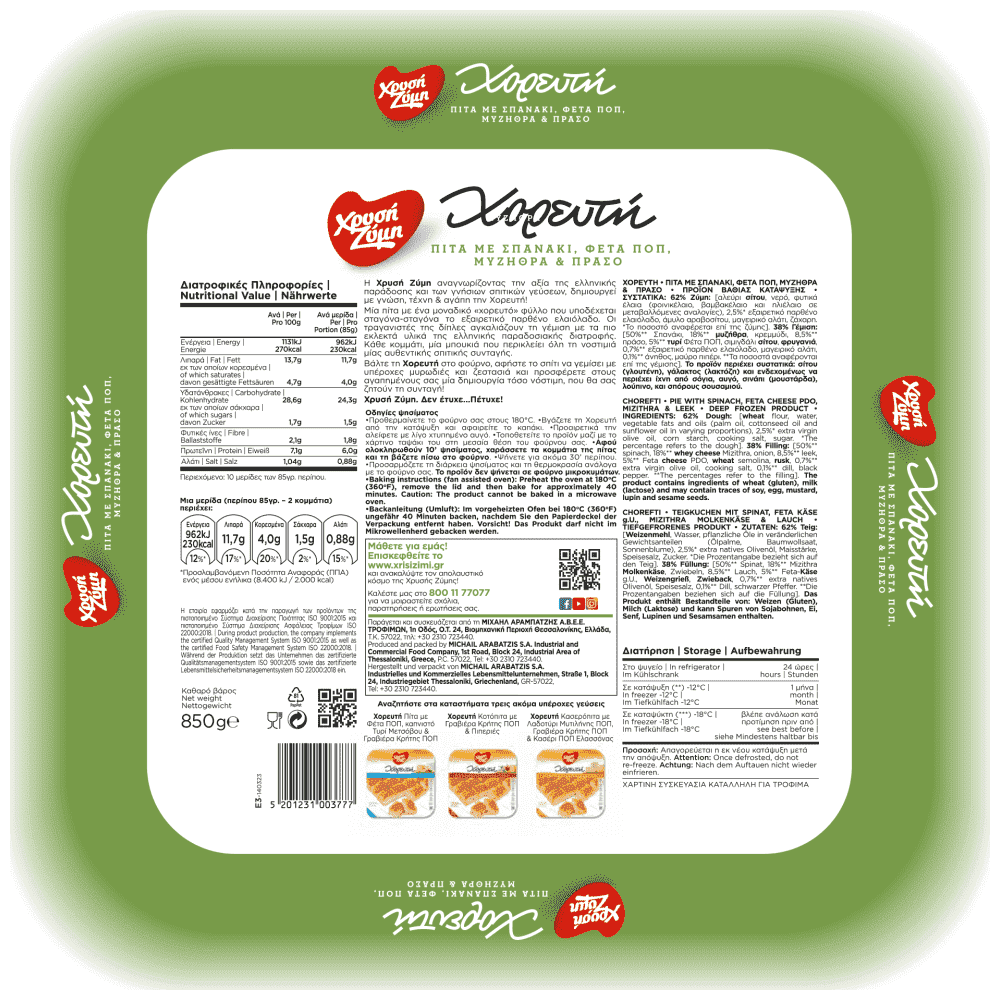 Γέμιση 38%: [Σπανάκι (50%), Μυζήθρα (18%), κρεμμύδι, πράσο (8,5%), τυρί Φέτα (5%) σιμιγδάλι σίτου, φρυγανιά, εξαιρετικό παρθένο ελαιόλαδο (0,7%), μαγειρικό αλάτι, άνηθος (0,1%), μαύρο πιπέρι. Τα ποσοστά εντός παρένθεσης αναφέρονται επί της γέμισης].