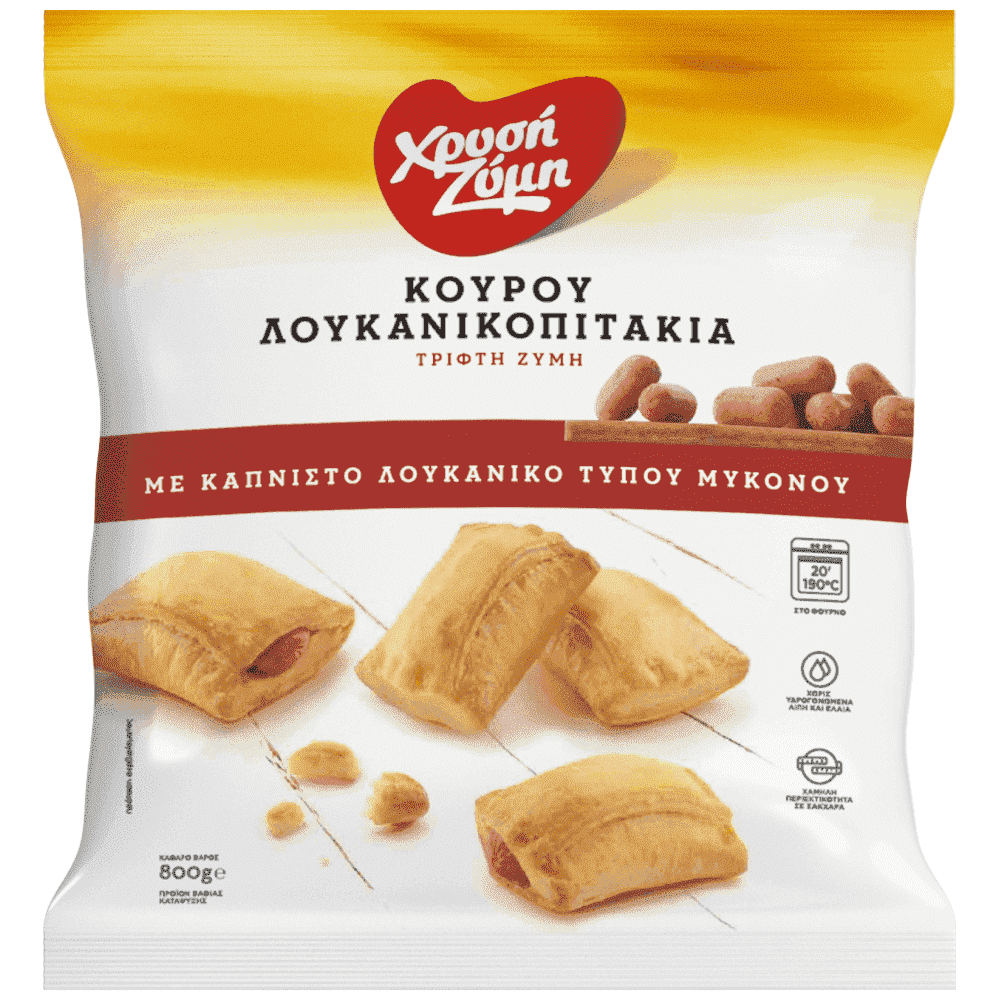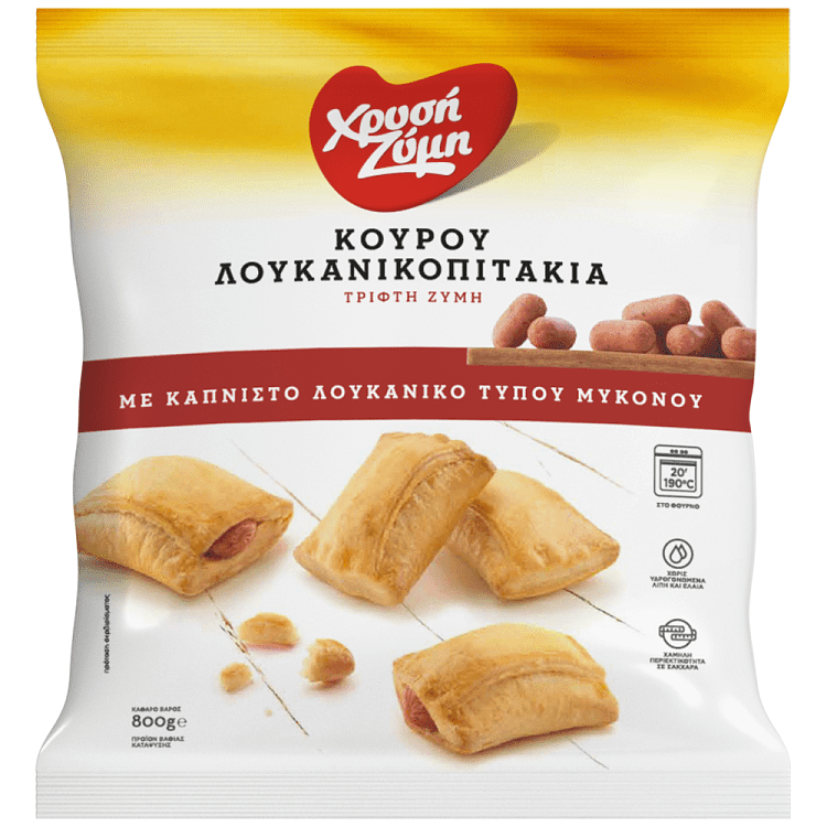 Τριφτή, μυρωδάτη Ζύμη Κουρού, ζυμωμένη με βούτυρο, αβγό και γάλα. Με λουκάνικα τύπου Μυκόνου για ένα λαχταριστό αποτέλεσμα!