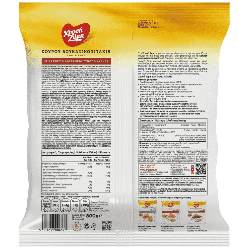 Ζύμη 73%: Αλεύρι σίτου, φυτική μαργαρίνη [μη υδρογονωμένα φυτικά λίπη και έλαια (φοινικέλαιο, βαμβακέλαιο και ηλιέλαιο σε μεταβαλλόμενες αναλογίες), νερό, γαλακτωματοποιητής: μονο- και διγλυκερίδια λιπαρών οξέων, μαγειρίκο αλάτι, μέσο οξίνισης: κιτρικό οξύ, αρωματική ύλη, χρωστική ουσία: β-καροτένιο], νερό, αυγό 4,5%, 3% βούτυρο , μαγιά, 1% άπαχο γάλα σε σκόνη, μαγειρικό αλάτι, μπέικινγκ πάουντερ (διογκωτικά: όξινο ανθρακικό νάτριο, δισόξινο πυροφωσφορικό νάτριο). Γέμιση 27%: Βραστό καπνιστό λουκάνικο τύπου Μυκόνου: 72% χοιρινό κρέας, νερό, άμυλο πατάτας,μαγειρικό αλάτι, πρωτεΐνη σόγιας, μπαχαρικά, δεξτρόζη, σταθεροποιητής: φωσφορικό νάτριο, αντιοξειδωτικό: εριθορβικό νάτριο, ενισχυτικό γεύσης: όξινο γλουταμινικό νάτριο, χρωστική ουσία: καρμίνιο, πρωτεϊνες κρέατος, αρτύματα, καπνιστών τροφίμων, συντηριτικό: νιτρώδες νάτριο. Το προϊόν περιέχει συστατικά: σίτου (γλουτένη), γάλακτος (λακτόζη), αυγού και σόγιας.Μπορεί να περιέχει ίχνη απο ξηρούς καρπούς, σέλινο, μουστάρδα και σπόρους σουσαμιού.Αλλεργιογόνα