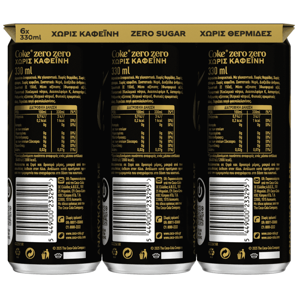 Αναζητάς κάτι γρήγορο να σε δροσίσει χωρίς θερμίδες; Η Coca-Cola Zero χωρίς Καφεΐνη είναι ένα θρυλικό ανθρακούχο αναψυκτικό με την ίδια υπέροχη γεύση, αλλά χωρίς ζάχαρη ή καφεΐνη, που φέρνει χαρά σε γενιές καταναλωτών αναψυκτικών σε όλο τον κόσμο. Ό,τι έχει να κάνει με την Coca-Cola είναι μοναδικό, από την εμβληματική της γεύση μέχρι τον δημοφιλή σχεδιασμό μπουκαλιού της. Αυτό το κλασικό και υπέροχα δροσιστικό ποτό έχει σχεδιαστεί για να σβήνει τη δίψα σου με μια έντονα διαπεραστική και γλυκιά γεύση, χωρίς θερμίδες ή καφεΐνη. Αλλά δεν είναι μόνο η υπέροχη γεύση. Η Coca-Cola Zero είναι πολλά περισσότερα. Είναι το απόλυτο ανθρακούχο αναψυκτικό που πάει με όλα, όπου κι αν είσαι, ό,τι κι αν κάνεις. Ετοιμάσου να δροσιστείς και να ξαναβάλεις μπρος με τη μοναδική γευστική εμπειρία που χαρίζει η Coca-Cola: την ένταση της δροσιάς που ακολουθείται από τις φυσαλίδες που σκάνε με μια μοναδική, απίστευτη γεύση. Κάνε μια παύση, απόλαυσε τη δροσιστική γεύση και άσε τον εαυτό σου να ταξιδέψει με κάθε γουλιά. Κάνε το αναψυκτικό Coca-Cola μέρος της ρουτίνας σου: στο σπίτι ή έξω, στη βόλτα ή στη δουλειά. Μοναδική γεύση Coca-Cola για να δροσιστείς και να ξαναβάλεις μπρος. Πρεσβεύει τις στιγμές ευτυχίας σου, είναι πάντα σε ετοιμότητα. Απλά άραξε με ένα κουτί Coca-Cola και χαλάρωσε. Πιες μια γουλιά και απελευθέρωσε τις φυσαλίδες στο εσωτερικό. Ανθρακούχο αναψυκτικό Coca-Cola Zero χωρίς Καφεΐνη με έντονες απολαυστικές γεύσεις. Ένα ποτό που αξίζει να μοιραστείς με φίλους και οικογένεια. Η Coca-Cola Zero σερβίρεται παγωμένη για μέγιστη απόλαυση.;