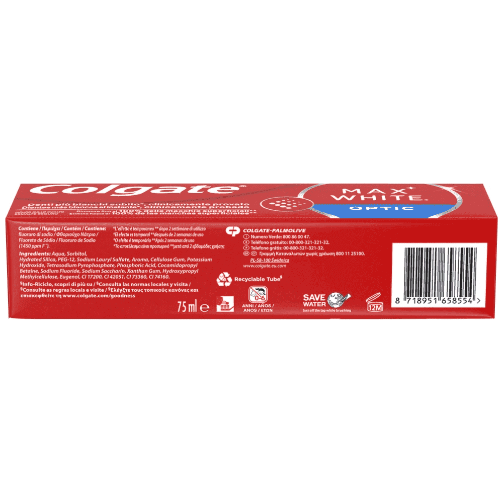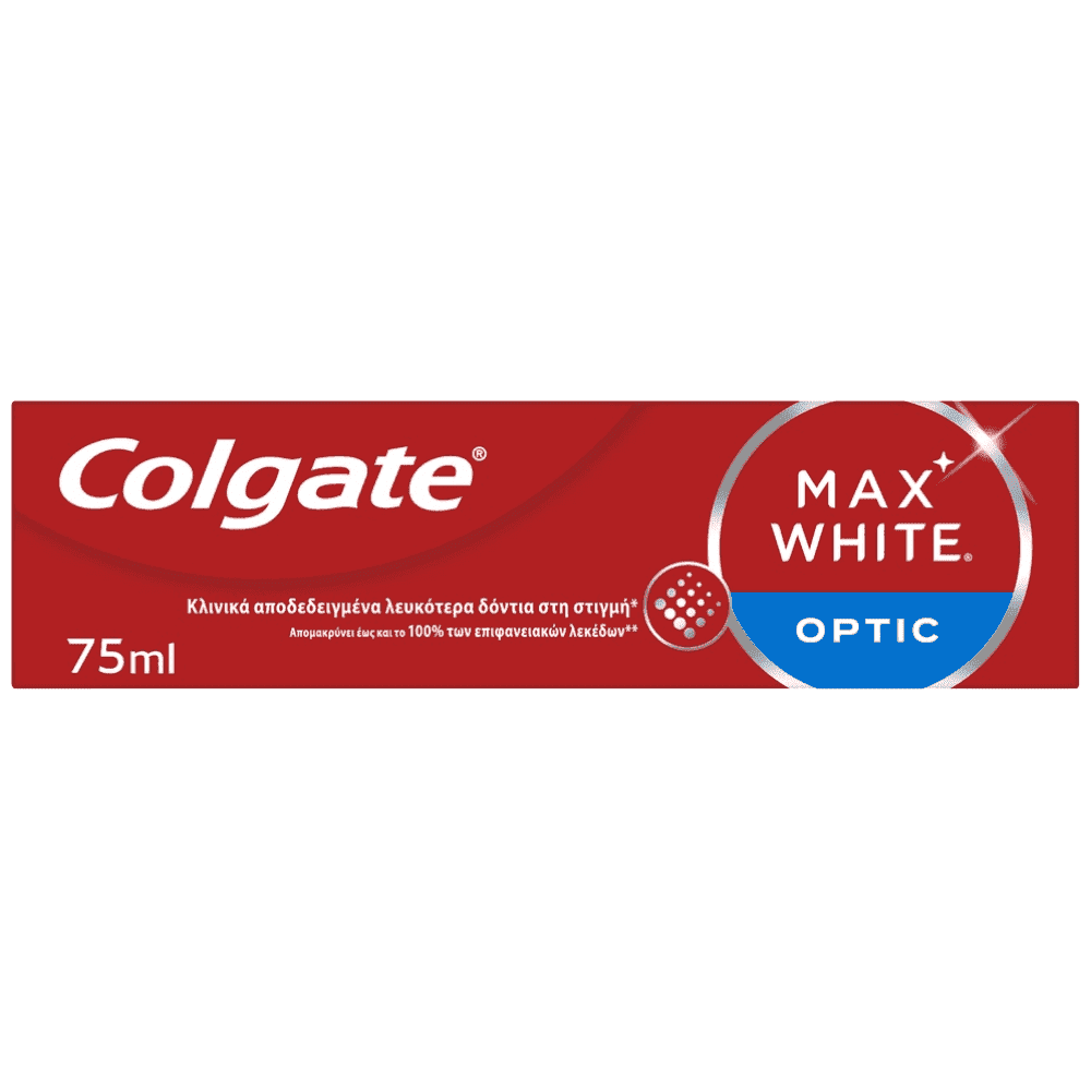 Η οδοντόκρεμα λεύκανσης Colgate Max White Optic με σύσταση που είναι κλινικά αποδεδειγμένο ότι αφαιρεί έως και το 100% των επιφανειακών λεκέδων. Οι οπτικοί λευκαντικοί παράγοντες παρέχουν άμεσο αποτέλεσμα λεύκανσης*. *Το αποτέλεσμα είναι προσωρινό.