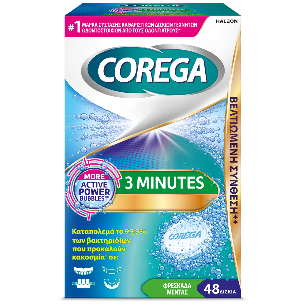 Χρησιμοποιήστε καθαριστικά δισκία Corega για να έχετε αυτοπεποίθηση κάθε μέρα.Οι τεχνητές οδοντοστοιχίες είναι περίπου 10 φορές πιο μαλακές από τα φυσικά σας δόντια και ο καθαρισμός τους με μια συνηθισμένη οδοντόκρεμα μπορεί να χαράξει την επιφάνειά τους δημιουργώντας σημεία στα οποία μπορούν να αναπτύσσονται βακτήρια. Τα καθαριστικά δισκία Corega 3 Minutes σας βοηθούν να καθαρίζετε την οδοντοστοιχία σας με καλύτερο τρόπο από ότι η οδοντόκρεμα*, καθώς δεν περιέχουν λειαντικές ουσίες, με αποτέλεσμα να καθαρίζουν χωρίς να χαράσσουν. Σε μόλις 3 λεπτά, καταπολεμούν το 99,9% των βακτηρίων που προκαλούν κακοσμία* και βοηθούν στην απομάκρυνση της πλάκας και των λεκέδων, όταν χρησιμοποιούνται σύμφωνα με τις οδηγίες χρήσης. Έτσι μπορείτε να διατηρήσετε την οδοντοστοιχία σας πιο καθαρή, πιο φρέσκια και πιο λαμπερή.* Δρα σε 3 λεπτά.* Σε εργαστηριακές δοκιμές βρέθηκε ότι καταπολεμά το 99.9% των βακτηρίων που προκαλούν κακοσμία*.* Όταν χρησιμοποιείται σύμφωνα με τις οδηγίες, βοηθά στη μείωση της πλάκας και αφαιρεί τους δύσκολους λεκέδες.* Εξειδικευμένη χρήση για τεχνητές οδοντοστοιχίες.Έχετε δοκιμάσει στερεωτική κρέμα Corega;Βοηθάει στη συγκράτηση της τεχνητής οδοντοστοιχίας όλη μέρα και εμποδίζει την εισχώρηση υπολειμμάτων τροφής. Χρησιμοποιήστε καθαριστικά δισκία και στερεωτική κρέμα Corega και νιώστε αυτοπεποίθηση φορώντας την οδοντοστοιχία σας.Η φροντίδα της τεχνητής οδοντοστοιχίας είναι σημαντική για να έχετε καλή στοματική υγεία.*σε εργαστηριακές δοκιμές
