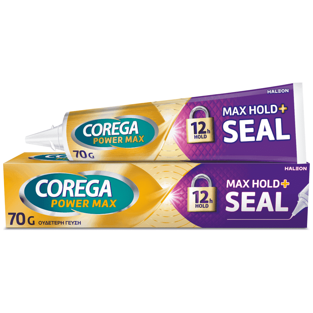 Η Corega Max Hold + Seal, στερεωτική κρέμα για την τεχνητή οδοντοστοιχία, προσφέρει το πιο δυνατό κράτημα* και 5 φορές μεγαλύτερη προστασία από τα υπολείμματα τροφής.