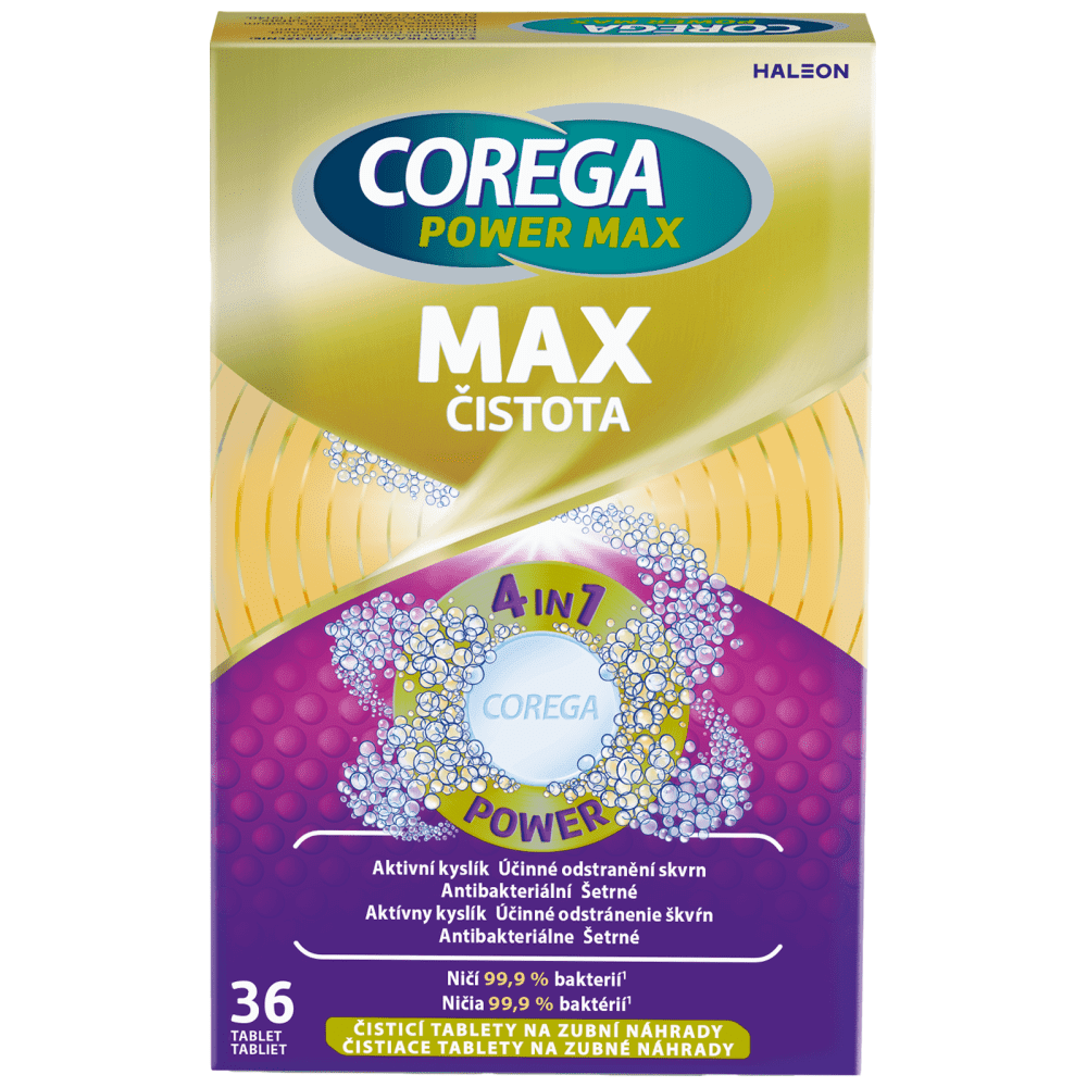 Τα καθαριστικά δισκία Corega Max Clean για τεχνητές οδοντοστοιχίες έχουν περισσότερο ενεργό οξυγόνο* για καλύτερη αφαίρεση λεκέδων*. Καταπολεμούν το 99.9% των βακτηριδίων** ενώ είναι απαλά με τις τεχνητές οδοντοστοιχίες