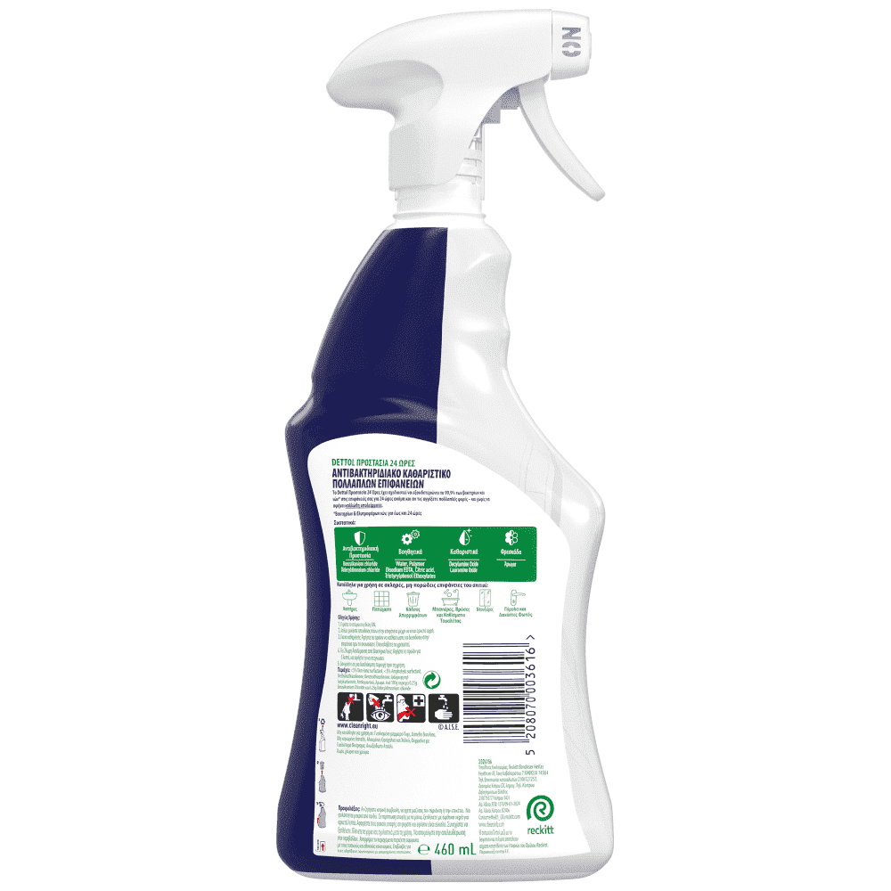 "ΤοDettolΠολυκαθαριστικό 24 Ώρες Ocean Fresh έχει σχεδιαστεί να εξουδετερώνει το 99,9%* των βακτηρίων και ιών* στις επιφάνειες σας για 24 ώρες ακόμα και αν τις αγγίξετε πολλαπλές φορές και χωρίς να αφήνει κολλώδη υπολείμματα"