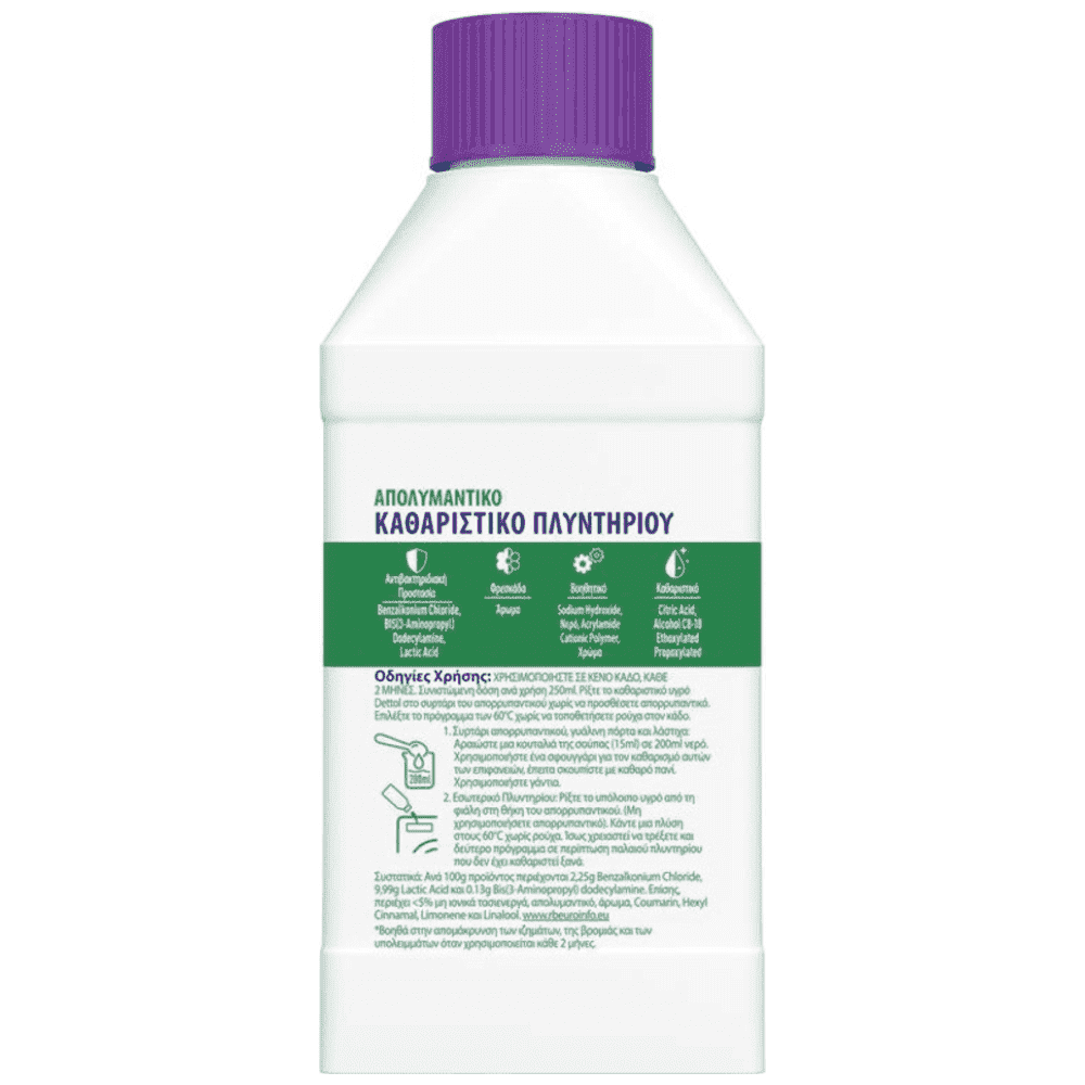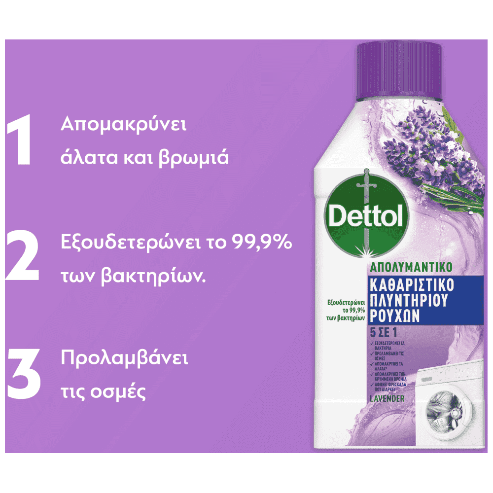 Χρησιμοποιήστε το Dettol απολυμαντικό καθαριστικό πλυντηρίου κάθε 2 μήνες σε μία πλύση με άδειο κάδο για να σκοτώσετε το 99,9% των βακτηριδίων που υπάρχουν στις επιφάνειες του πλυντηρίου που δε βλέπετε ,να απαλαγείτε απο τη κρυμμένη βρωμιά και να βελτιώστε τη λειτουργία του πλυντηρίου σας. Φτιαγμένο απο ισχυρά καθαριστικά το Dettol απολυμαντικό καθαριστικό πλυντηρίου θα απολυμάνει τα κρυμμένα εξαρτήματα του πλυντηρίου σας και θα διώξει τις δυσάρεστες οσμές αφήνοντας μια διαρκή αίσθηση φρεσκάδας. Με άρωμα Λεβάντα.