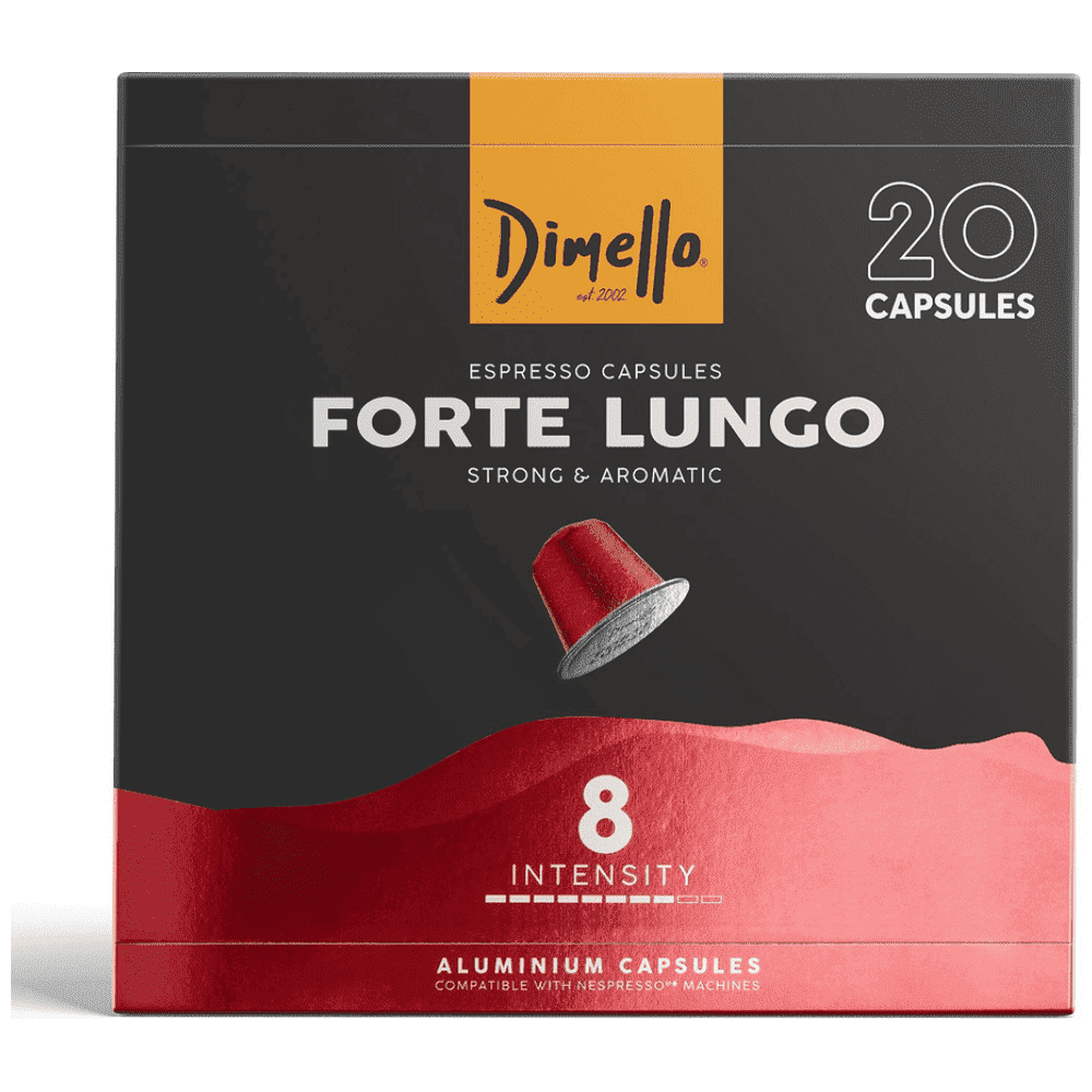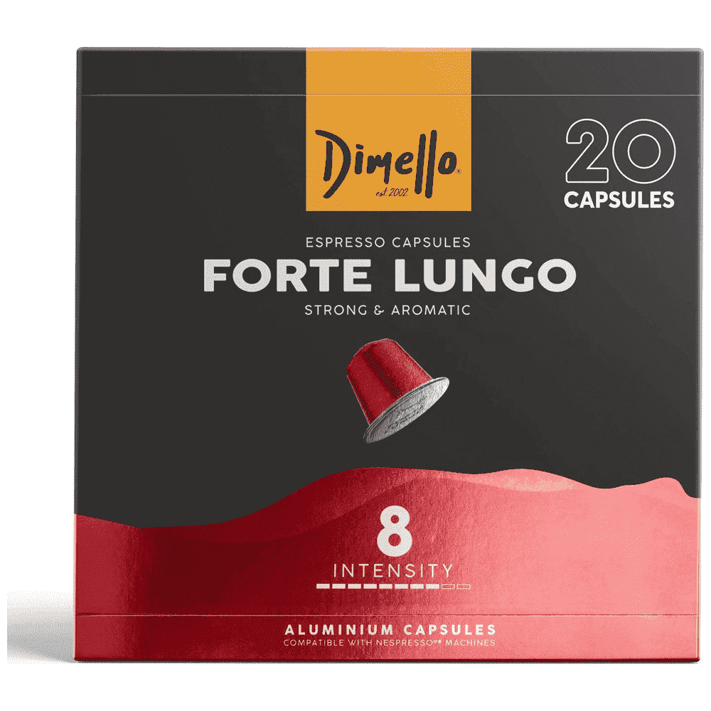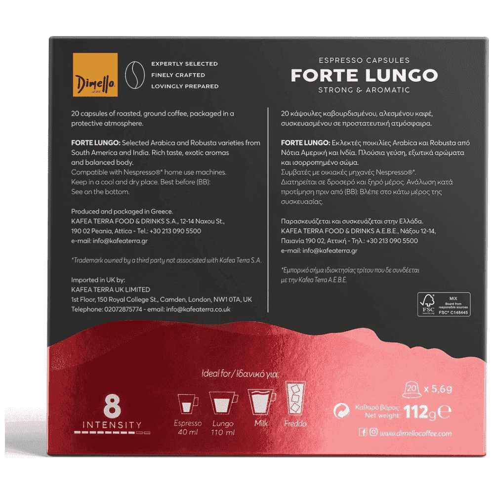 Οι κάψουλες Forte Lungo με το σκούρο καβούρδισμά του συνδυάζει Arabica από τη Βραζιλία για σώμα και ένταση με Robusta Ινδίας για έντονες νότες σοκολάτας. Απολαύστε τον σε Espresso Lungo. Ιδανικός για παρασκευή Freddo.