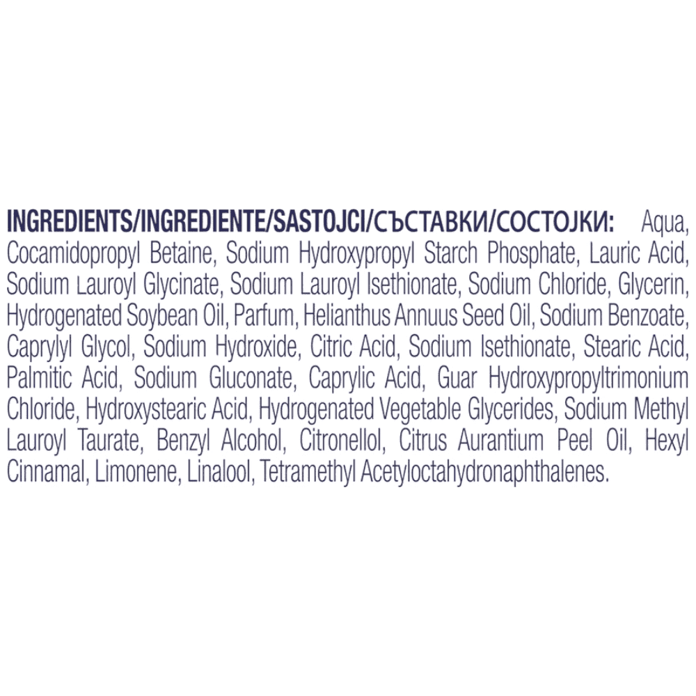 Cocamidopropyl Betaine, Sodium Hydroxypropyl Starch Phosphate, Lauric Acid, Sodium Lauroyl Glycinate, Sodium Lauroyl Isethionate, Sodium Chloride, Glycerin, Hydrogenated Soybean Oil, Parfum, Helianthus Annuus Seed Oil, Sodium Benzoate, Caprylyl Glycol, Sodium Hydroxide, Citric Acid, Sodium Isethionate, Stearic Acid, Palmitic Acid, Sodium Gluconate, Caprylic Acid, Guar Hydroxypropyltrimonium Chloride, Hydroxystearic Acid, Hydrogenated Vegetable Glycerides, Sodium Methyl Lauroyl Taurate, Benzyl Alcohol, Citronellol, Citrus Aurantium Peel Oil, Hexyl Cinnamal, Limonene, Linalool, Tetramethyl Acetyloctahydronaphthalenes.Αλλεργιογόνα