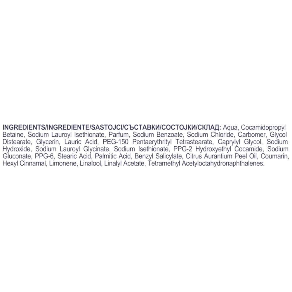 Aqua, Cocamidopropyl Betaine, Sodium Lauroyl Isethionate, Parfum, Sodium Benzoate, Sodium Chloride, Carbomer, Glycol Distearate, Glycerin, Lauric Acid, PEG-150 Pentaerythrityl Tetrastearate, Caprylyl Glycol, Sodium Hydroxide, Sodium Lauroyl Glycinate, Sodium Isethionate, PPG-2 Hydroxyethyl Cocamide, Sodium Gluconate, PPG-6, Stearic Acid, Palmitic Acid, Benzyl Salicylate, Citrus Aurantium Peel Oil, Coumarin, Hexyl Cinnamal, Limonene, Linalool, Linalyl Acetate, Tetramethyl Acetyloctahydronaphthalenes.