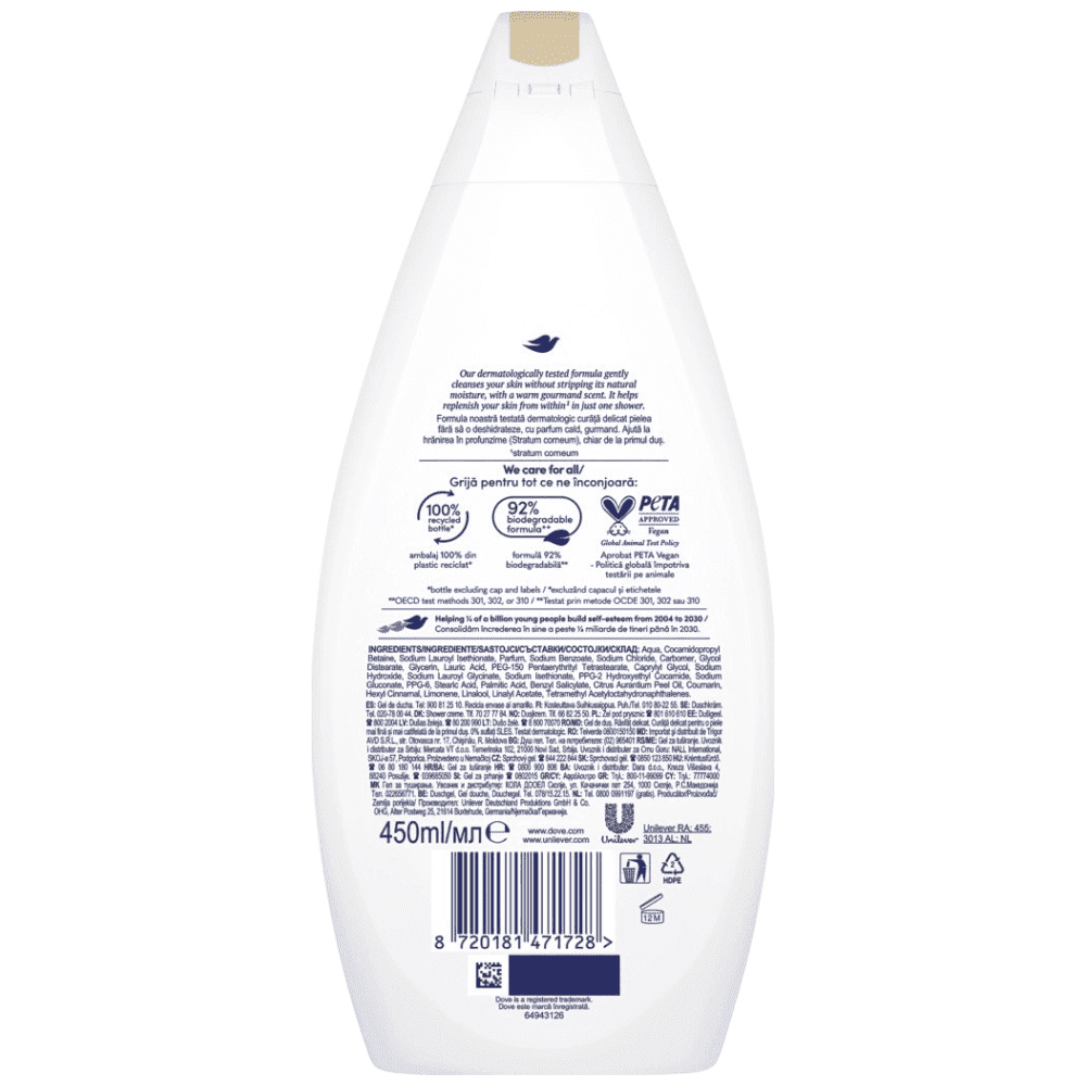 Τοποθετήστε στις παλάμες σας αρκετή ποσότητα από το αφρόλουτρο Dove Genlte Pamper. Κάντε μασάζ με το αναζωογονητικό αφρόλουτρο στο δέρμα σας και στη συνέχεια ξεπλύνετε για να απολαύσετε μεταξένια απαλή και λεία επιδερμίδα.