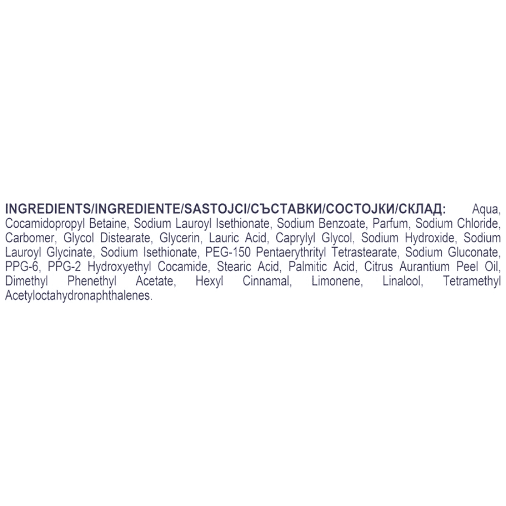 Aqua, Cocamidopropy! Betaine, Sodium Lauroyl Isethionate, Sodium Benzoate, Parfum, Sodium Chloride, Carbomer, Glycol Distearate, Glycerin, Lauric Acid, Caprylyl Glycol, Sodium Hydroxide, Sodium Lauroyl Glycinate, Sodium Isethionate, PEG-150 Pentaerythrityl Tetrastearate, Sodium Gluconate, PPG-6, PPG-2 Hydroxyethyl Cocamide, Stearic Acid, Palmitic Acid, Citrus Aurantium Peel Oil, Dimethyl Phenethyl Acetate, Hexyl Cinnamal, Limonene, Linalool, Tetramethyl Acetyloctahydronaphthalenes.Αλλεργιογόνα