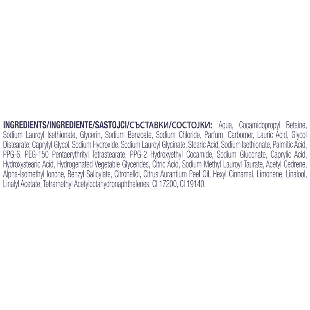 Aqua, Cocamidopropyl Betaine, Sodium Lauroyl Isethionate, Glycerin, Sodium Benzoate, Sodium Chloride, Parfum, Carbomer, Lauric Acid, Glycol Distearate, Caprylyl Glycol, Sodium Hydroxide, Sodium Lauroyl Glycinate, Stearic Acid, Sodium Isethionate, Palmitic Acid, PPG-6, PEG-150 Pentaerythrityl Tetrastearate, PPG-2 Hydroxyethyl Cocamide, Sodium Gluconate, Caprylic Acid, Hydroxystearic Acid, Hydrogenated Vegetable Glycerides, Citric Acid, Sodium Methyl Lauroyl Taurate, Acetyl Cedrene, Alpha-Isomethyl Ionone, Benzyl Salicylate, Citronellol, Citrus Aurantium Peel Oil, Hexyl Cinnamal, Limonene, Linalool, Linalyl Acetate, Tetramethyl Acetyloctahydronaphthalenes, CI 17200, CI 19140.Αλλεργιογόνα