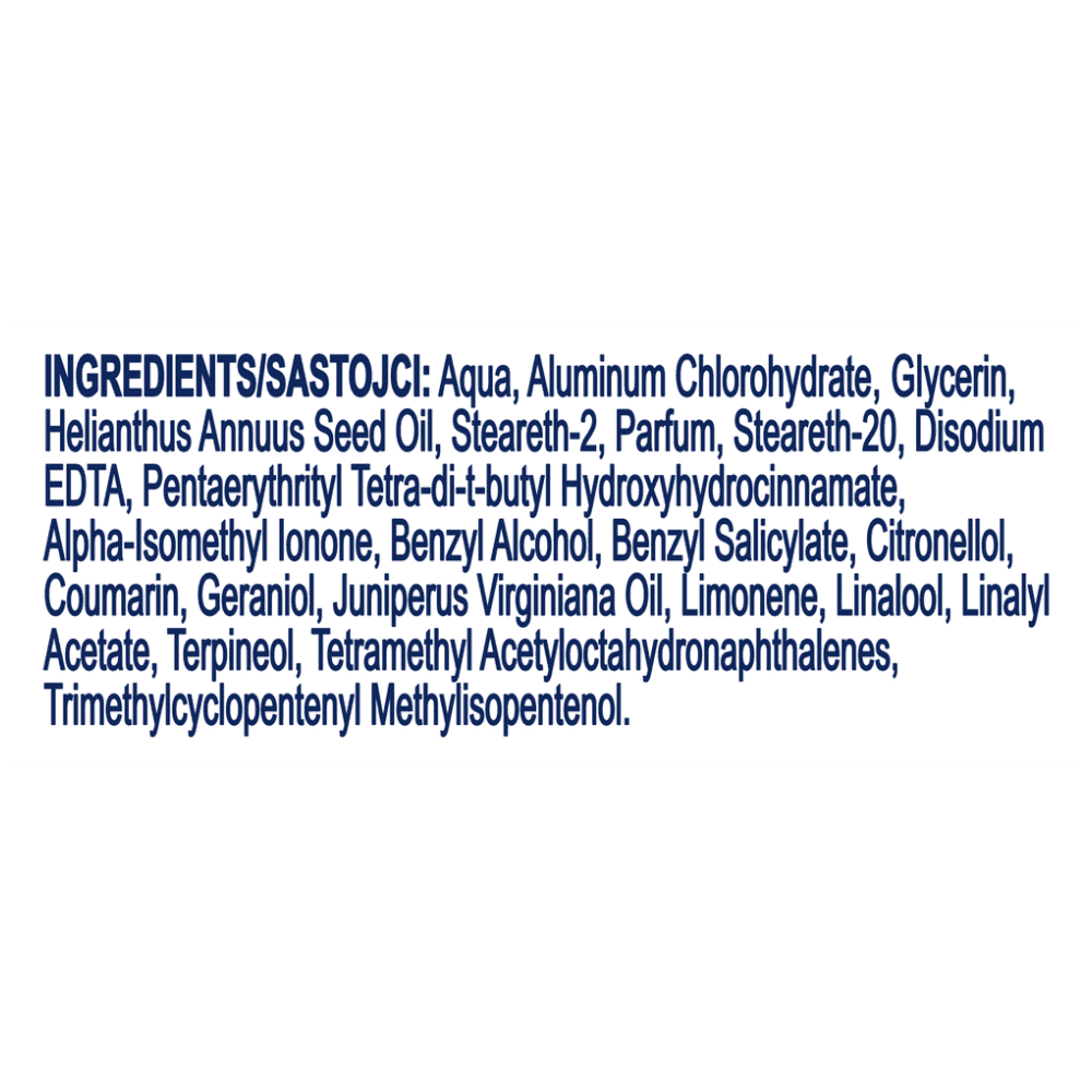 Aqua, Aluminum Chlorohydrate, Glycerin, Helianthus Annuus Seed Oil, Steareth2, Parfum, Steareth20, Disodium EDTA, Pentaerythrityl Tetraditbutyl Hydroxyhydrocinnamate, AlphaIsomethyl Ionone, Benzyl Alcohol, Benzyl Salicylate, Citronellol, Coumarin, Geraniol, Juniperus Virginiana Oil, Limonene, Linalool, Linalyl Acetate, Terpineol, Tetramethyl Acetyloctahydronaphthalenes, Trimethylcyclopentenyl Methylisopentenol.Αλλεργιογόνα