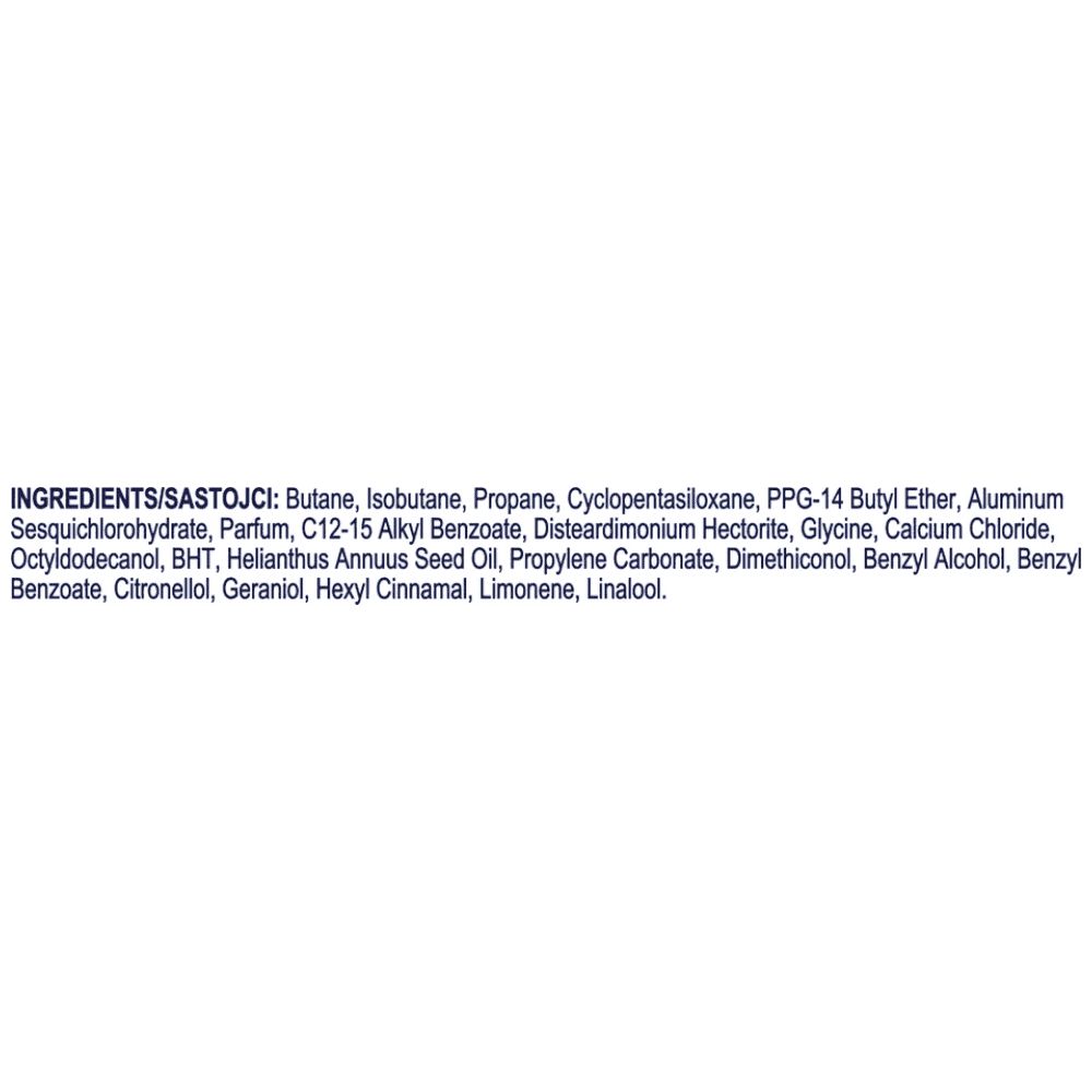 Butane, Isobutane, Propane, Cyclopentasiloxane, PPG-14 Butyl Ether, Aluminum Sesquichlorohydrate, Parfum, Helianthus Annuus Seed Oil, C12-15 Alkyl Benzoate, Disteardimonium Hectorite, Glycine, Calcium Chloride, Octyldodecanol, BHT, Propylene Carbonate, Dimethiconol, Alpha-Isomethyl Ionone, Benzyl Alcohol, Benzyl Salicylate, Citronellol, Coumarin, Eugenol, Geraniol, Hexyl Cinnamal.