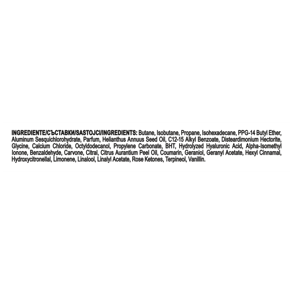 Butane, Isobutane, Propane, Isohexadecane, PPG14 Butyl Ether, Aluminum Sesquichlorohydrate, Parfum, Helianthus Annuus Seed Oil, C1215 Alkyl Benzoate, Disteardimonium Hectorite, Glycine, Calcium Chloride, Octyldodecanol, Propylene Carbonate, BHT, Hydrolyzed Hyaluronic Acid, AlphaIsomethyl Ionone, Benzaldehyde, Carvone, Citral, Citrus Aurantium Peel Oil, Coumarin, Geraniol, Geranyl Acetate, Hexyl Cinnamal, Hydroxycitronellal, Limonene, Linalool, Linalyl Acetate, Rose Ketones, Terpineol, Vanillin.Αλλεργιογόνα