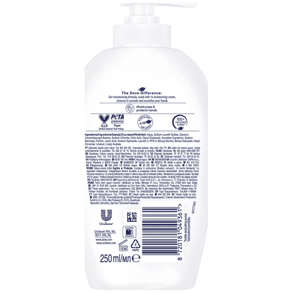 Dove Care & Protect Υγρό Κρεμοσάπουνο με αντιβακτηριδιακό παράγοντα συνδυάζει τον καθαρισμό με τη φροντίδα της επιδερμίδας των χεριών, αφήνοντας τη λεία, απαλή και προστατευμένη.