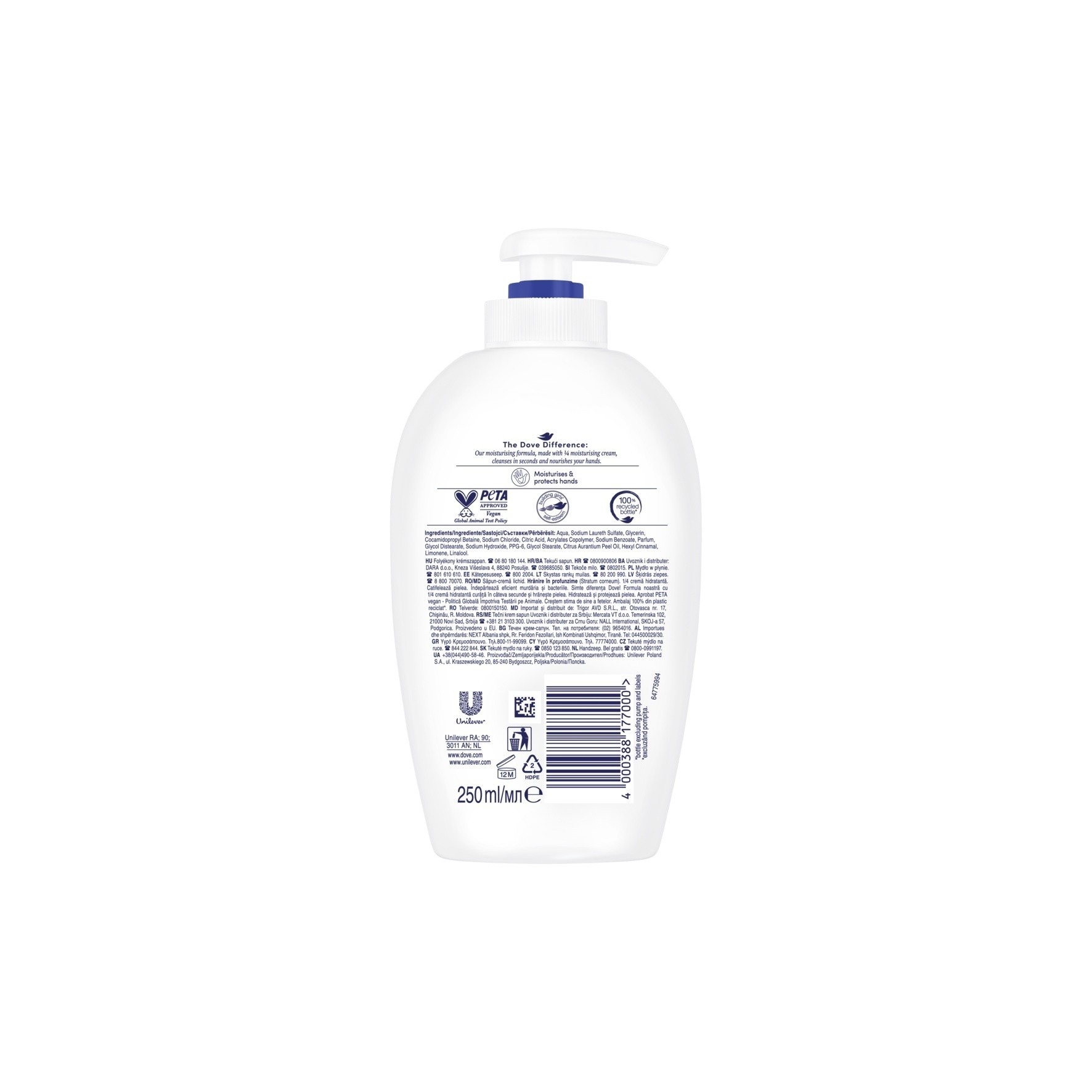 Υγρό κρεμοσάπουνο για τα χέρια, που καθαρίζει και ενυδατώνει την επιδερμίδα των χεριών. Με φυσικούς για την επιδερμίδα ενυδατικούς παράγοντες. Με ήπιους καθαριστικούς παράγοντες Τεχνολογία με 1/4 ενυδατική κρέμα. Δώστε στα χέρια σας ένα άγγιγμα υγιεινής ενυδάτωσης με το Υγρό Κρεμοσάπουνο Dove.