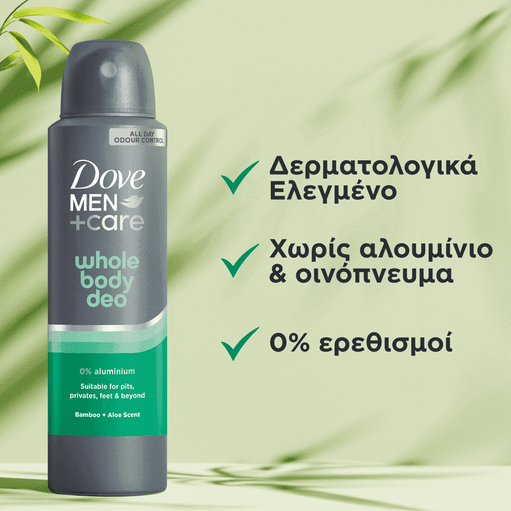 Νέο Spray αποσμητικό για ΟΛΟ το σώμα. Άρωμα Βamboo & Αλόης. Ολοήμερη προστασία κατά των οσμών. Aπαλό με το δέρμα. Χωρίς αλουμίνιο & οινόπνευμα. Δερματολογικά ελεγμένο. 0% ερεθισμοί