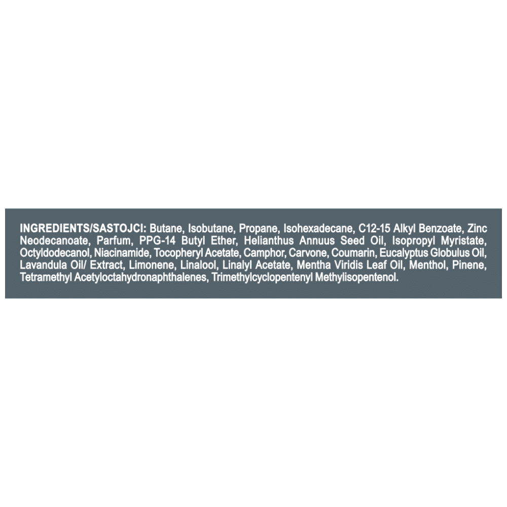 Butane, Isobutane, Propane, Isohexadecane, C12-15 Alkyl Benzoate, Zinc Neodecanoate, Parfum, PPG-14 Butyl Ether, Helianthus Annuus Seed Oil, Isopropyl Myristate, Octyldodecanol, Niacinamide, Tocopheryl Acetate, Camphor, Carvone, Coumarin, Eucalyptus Globulus Oil, Lavandula Oil/Extract, Limonene, Linalool, Linalyl Acetate, Mentha Viridis Leaf Oil, Menthol, Pinene, Tetramethyl Acetyloctahydronaphthalenes, Trimethylcyclopentenyl Methylisopentenol.