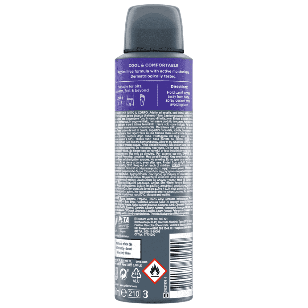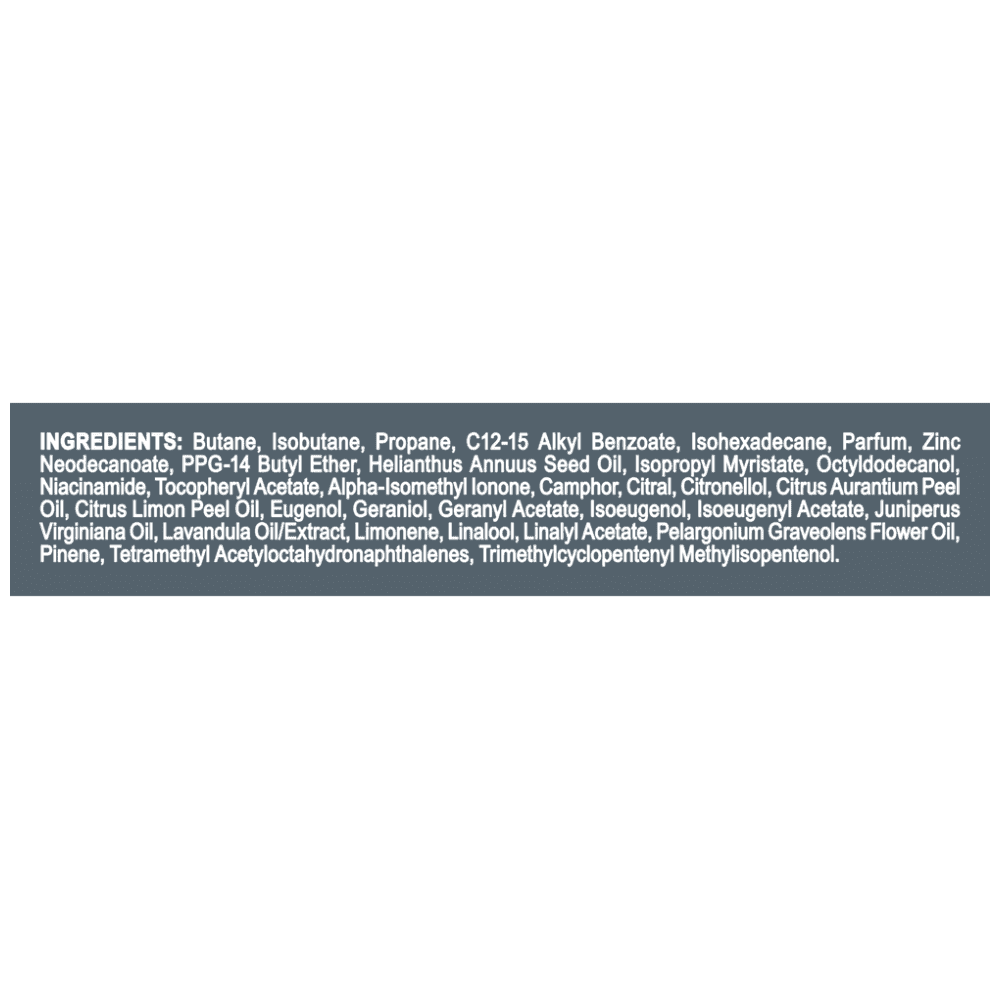 Butane, Isobutane, Propane, C12-15 Alkyl Benzoate, Isohexadecane, Parfum, Zinc Neodecanoate, PPG-14 Butyl Ether, Helianthus Annuus Seed Oil, Isopropyl Myristate, Octyldodecanol, Niacinamide, Tocopheryl Acetate, Alpha-Isomethyl Ionone, Camphor, Citral, Citronellol, Citrus Aurantium Peel Oil, Citrus Limon Peel Oil, Eugenol, Geraniol, Geranyl Acetate, Isoeugenol, Isoeugenyl Acetate, Juniperus Virginiana Oil, Lavandula Oil/Extract, Limonene, Linalool, Linalyl Acetate, Pelargonium Graveolens Flower Oil, Pinene, Tetramethyl Acetyloctahydronaphthalenes, Trimethylcyclopentenyl Methylisopentenol.
