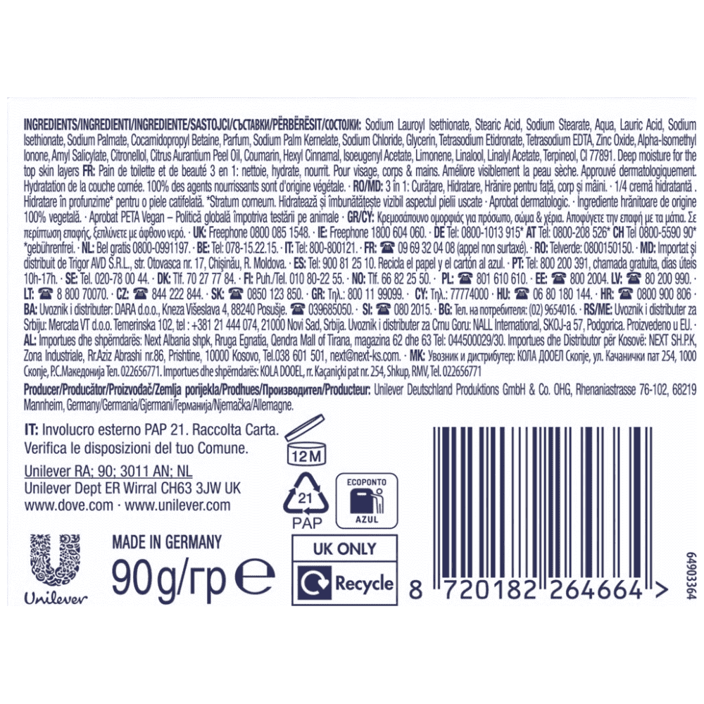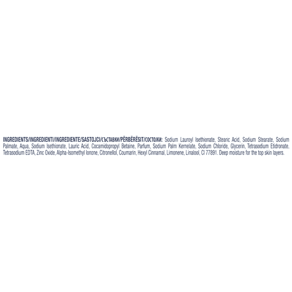 Sodium Lauroyl Isethionate, Stearic Acid, Sodium Stearate, Sodium Palmate, Aqua, Sodium Isethionate, Lauric Acid, Cocamidopropyl Betaine, Parfum, Sodium Palm Kernelte, Sodium Chloride, Glycerin, Tetrasodium Etidronate, Tetrasodium EDTA, Zinc Oxide, Alpha-Isomethyl Ionone, Citronellol, Coumarin, Hexyl Cinnamal, Limonene, Linalool, CI 77891. Deep moisture for the top skin layers.Αλλεργιογόνα