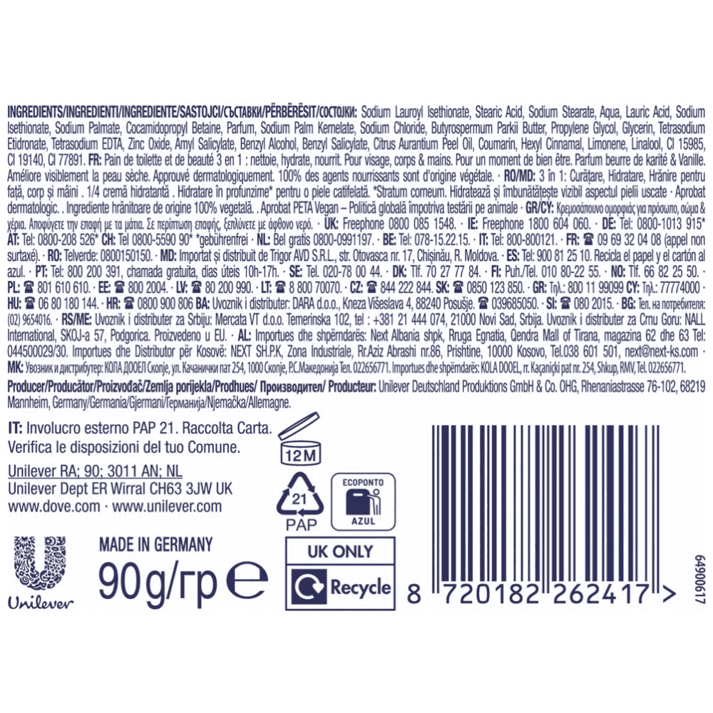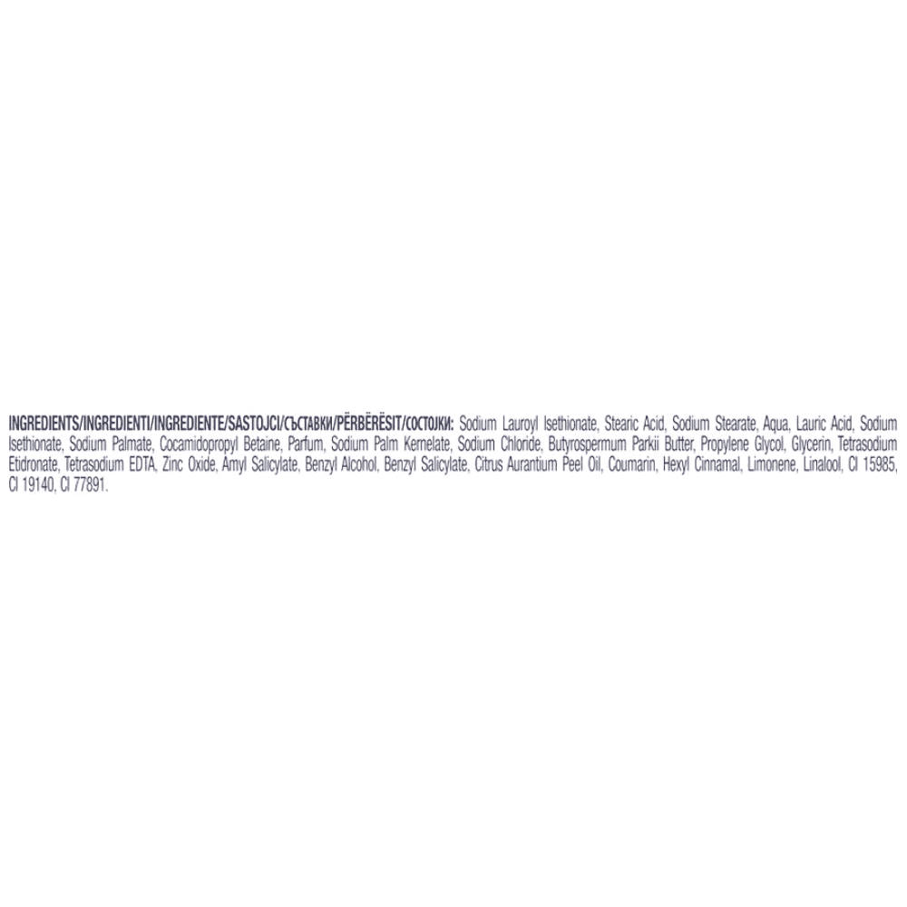 Sodium Lauroyl Isethionate, Stearic Acid, Sodium Stearate, Aqua, Lauric Acid, Sodium Isethionate, Sodium Palmate, Cocamidopropyl Betaine, Parfum, Sodium Palm Kernelate, Sodium Chloride, Butyrospermum Parkii Butter, Propylene Glycol, Glycerin, Tetrasodium Etidronate, Tetrasodium EDTA, Zinc Oxide, Amyl Salicylate, Benzyl Alcohol, Benzyl Salicylate, Citrus Aurantium Peel Oil, Coumarin, Hexyl Cinnamal, Limonene, Linalool, CI 15985, CI 19140, CI 77891.Αλλεργιογόνα