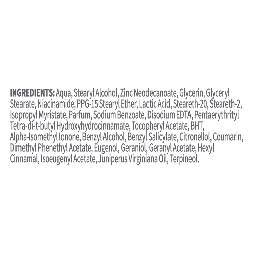 Aqua, Stearyl Alcohol, Zinc Neodecanoate, Glycerin, Glyceryl Stearate, Niacinamide, PPG-15 Stearyl Ether, Lactic Acid, Steareth-20, Steareth-2, Isopropyl Myristate, Parfum, Sodium Benzoate, Disodium EDTA, Pentaerythrityl Tetra-di-t-butyl Hydroxyhydrocinnamate, Tocopheryl Acetate, BHT, Alpha-Isomethyl Ionone, Benzyl Alcohol, Benzyl Salicylate, Citronellol, Coumarin, Dimethyl Phenethyl Acetate, Eugenol, Geraniol, Geranyl Acetate, Hexyl Cinnamal, Isoeugenyl Acetate, Juniperus Virginiana Oil, Terpineol.