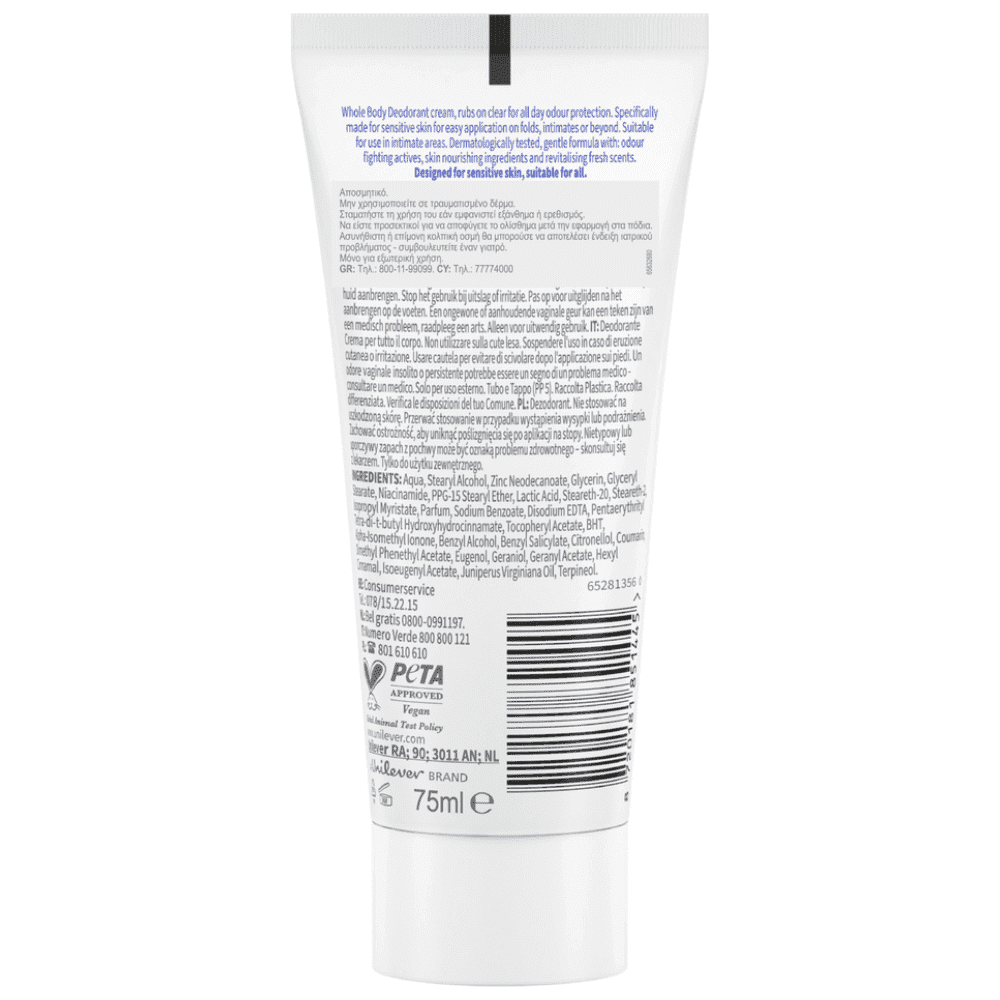 Νέα Kρέμα αποσμητικό για ΟΛΟ το σώμα. Ολοήμερη προστασία κατά των οσμών. Aπαλή με το δέρμα. 0% άλατα αλουμινίου. Γυναικολογικά & Δερματολογικά ελεγμένη. Περιέχει 3% Βιταμίνη Β3. Ενυδατώνει το δέρμα.