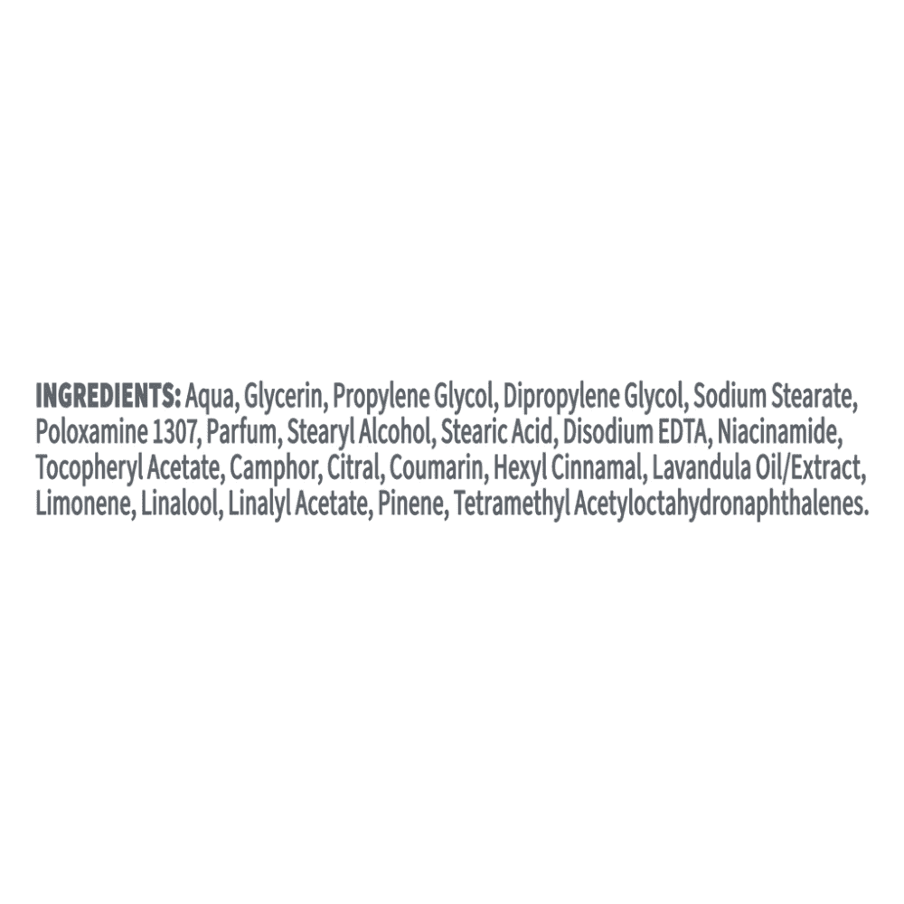 Aqua, Glycerin, Propylene Glycol, Dipropylene Glycol, Sodium Stearate, Poloxamine 1307, Parfum, Stearyl Alcohol, Stearic Acid, Disodium EDTA, Niacinamide, Tocopheryl Acetate, Camphor, Citral, Coumarin, Hexyl Cinnamal, Lavandula Oil/Extract, Limonene, Linalool, Linalyl Acetate, Pinene, Tetramethyl Acetyloctahydronaphthalenes.
