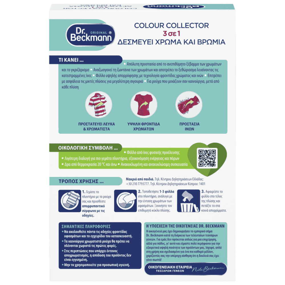 Το Dr Beckmann Colour Collector 3σε1 δεσμεύει χρώμα και βρωμιά, προστατεύει τα λευκά και τα χρωματιστά, παρέχει υψηλή φροντίδα χρωμάτων και προστασία ινών. Προσφέρει απόλυτη προστασία από το ανεπιθύμητο ξέβαμμα των χρωμάτων και το γκριζάρισμα, ενώ αναζωογονεί τη ζωντάνια των χρωμάτων και αποτρέπει το ξεθώριασμα, λειαίνοντας τις κατεστραμμένες ίνες. Το φύλλο υψηλής απορρόφησης, με τεχνολογία φροντίδας χρώματος και ινών, επιτρέπει με ασφάλεια τις μικτές πλύσεις για μεγαλύτερη σιγουριά. Για ρούχα που μοιάζουν σαν καινούρια, μετά από κάθε πλύση!