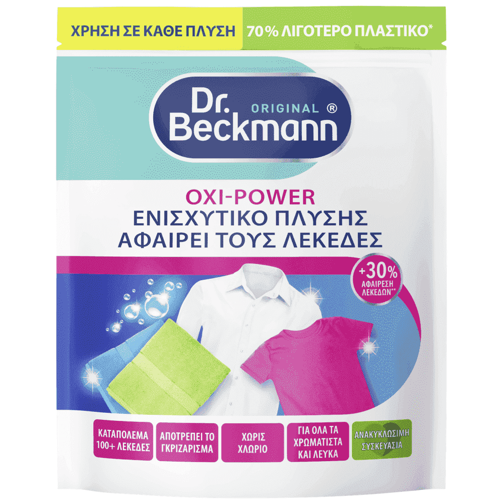 Το Dr Beckmann Oxi-Power αφαιρεί τους λεκέδες, ενώ ενισχύει το πλύσιμο των ρούχων σας. Καταπολεμά δύσκολους λεκέδες, προσφέροντας καθαριότητα και υγιεινή των ινών των ρούχων σε βάθος. Η ισχυρή του σύνθεση αφαιρεί ακόμη και τους ελαφρούς αποχρωματισμούς, ενώ αποτρέπει και το γκριζάρισμα. Η τεχνολογία αποτελεσματικής δράσης οξυγόνου διατηρεί τα ρούχα σας σαν καινούρια!