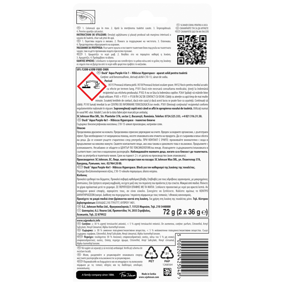 Duck Aqua Purple 4in1 - Hibiscus Hyperspace. Block για τον καθαρισμό της λεκάνης της τουαλέτας. Περιέχει Βενζολοσουλφονικού οξέος, C10-13-αλκυλο παραγώγων, άλατα νατρίου. Κίνδυνος Προκαλεί ερεθισμό του δέρματος. Προκαλεί σοβαρή οφθαλμική βλάβη. Επιβλαβές για τους υδρόβιους οργανισμούς, με μακροχρόνιες επιπτώσεις. Εάν ζητήσετε ιατρική συμβουλή, να έχετε μαζί σας τον περιέκτη του προϊόντος ή την ετικέτα. Μακριά από παιδιά. Πλύνετε τα χέρια σχολαστικά μετά το χειρισμό. ΣΕ ΠΕΡΙΠΤΩΣΗ ΕΠΑΦΗΣ ΜΕ ΤΑ ΜΑΤΙΑ: Ξεπλύνετε προσεκτικά με νερό για αρκετά λεπτά. Αν υπάρχουν φακοί επαφής, αφαιρέστε τους, αν είναι εύκολο. Συνεχίστε να ξεπλένετε. Καλέστε αμέσως το ΚΕΝΤΡΟ ΔΗΛΗΤΗΡΙΑΣΕΩΝ/γιατρό. Διάθεση του περιεχομένου / περιέκτη σύμφωνα με τους τοπικούς / εθνικούς κανονισμούς. Προσέχετε τα μικρά παιδιά όταν βρίσκονται κοντά στη λεκάνη. Για χρήση στη λεκάνη της τουαλέτας μόνο. Τηλ. Κέντρου Δηλητηριάσεων: ΕΛΛΑΔΑΣ 210 7793777, ΚΥΠΡΟΥ 1401.