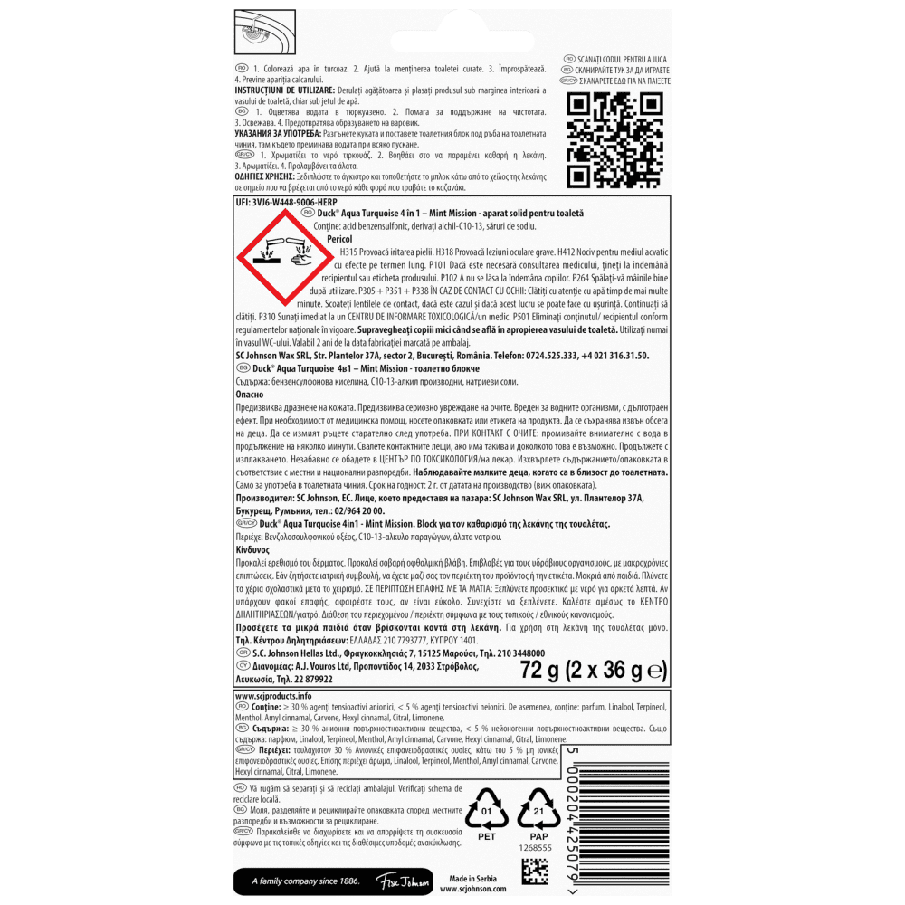 Duck Aqua Turquoise 4in1 - Mint Mission. Block για τον καθαρισμό της λεκάνης της τουαλέτας. Περιέχει Βενζολοσουλφονικού οξέος, C10-13-αλκυλο παραγώγων, άλατα νατρίου. Κίνδυνος Προκαλεί ερεθισμό του δέρματος. Προκαλεί σοβαρή οφθαλμική βλάβη. Επιβλαβές για τους υδρόβιους οργανισμούς, με μακροχρόνιες επιπτώσεις. Εάν ζητήσετε ιατρική συμβουλή, να έχετε μαζί σας τον περιέκτη του προϊόντος ή την ετικέτα. Μακριά από παιδιά. Πλύνετε τα χέρια σχολαστικά μετά το χειρισμό. ΣΕ ΠΕΡΙΠΤΩΣΗ ΕΠΑΦΗΣ ΜΕ ΤΑ ΜΑΤΙΑ: Ξεπλύνετε προσεκτικά με νερό για αρκετά λεπτά. Αν υπάρχουν φακοί επαφής, αφαιρέστε τους, αν είναι εύκολο. Συνεχίστε να ξεπλένετε. Καλέστε αμέσως το ΚΕΝΤΡΟ ΔΗΛΗΤΗΡΙΑΣΕΩΝ/γιατρό. Διάθεση του περιεχομένου / περιέκτη σύμφωνα με τους τοπικούς / εθνικούς κανονισμούς. Προσέχετε τα μικρά παιδιά όταν βρίσκονται κοντά στη λεκάνη. Για χρήση στη λεκάνη της τουαλέτας μόνο. Τηλ. Κέντρου Δηλητηριάσεων: ΕΛΛΑΔΑΣ 210 7793777, ΚΥΠΡΟΥ 1401."