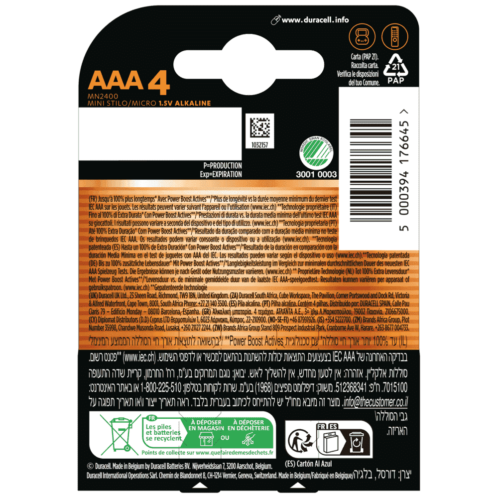 Αλκαλικές μπαταρίες (4 τεμάχια), μεγέθους ΑΑΑ με τεχνολογία PowerBoost που εμποδίζει την απώλεια ενέργειας. Μεγαλύτερη ισχύ. Καλύτερη απόδοση. Κατάλληλες για μικρές συσκευές. Μέγεθος: ΑΑΑ/1.5V.