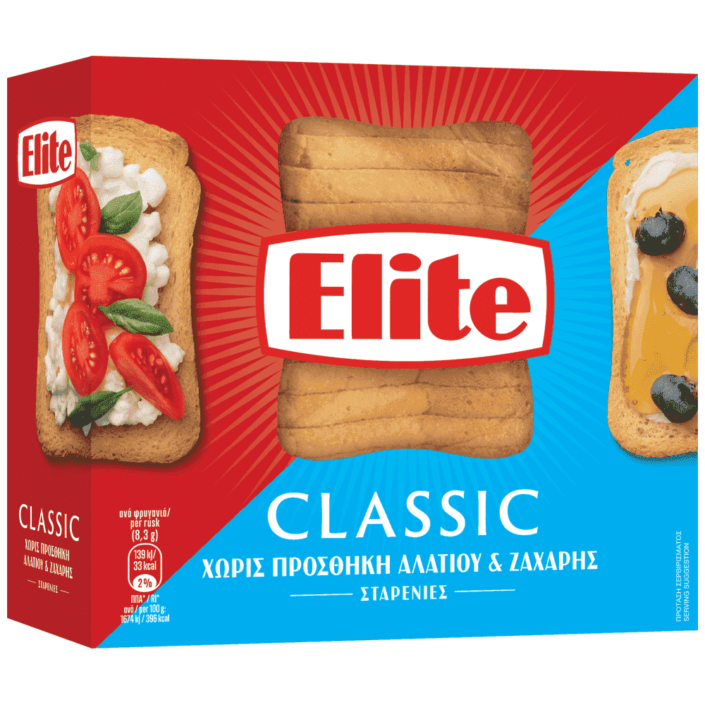 Η Elite της ποιότητας, της διατροφικής αξίας και των νέων γευστικών εμπειριών, χρόνια τώρα δημιουργεί με φροντίδα και αγάπη ό,τι πιο νόστιμο και θρεπτικό. Ακολουθώντας την ίδια πάντα συνταγή επιτυχίας από το 1968, παραμένει πιστή στις αξίες που την ανέδειξαν ως κορυφαία μάρκα φρυγανιάς και συνεχίζει να πρωτοπορεί με γευστικές προτάσεις που ενθουσιάζουν. Με έμφαση στις ανάγκες του σύγχρονου καταναλωτή, η Elite επεκτάθηκε στην κατηγορία των σνακ με τα Elite Crackers Μεσογειακά και έθεσε τις βάσεις για την ανάπτυξη καινοτόμων προϊόντων με άξονα τη μεσογειακή διατροφή, προσφέροντας έτσι διατροφικής αξίας ισορροπημένες επιλογές σνακ. Με τόσες προϊοντικές επιλογές από την Elite για κάθε στιγμή της ημέρας, οι γευστικές ιδέες δεν σταματούν ποτέ!