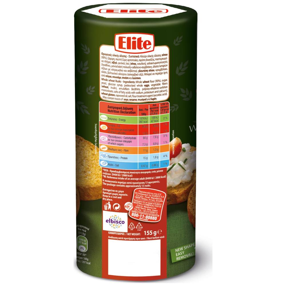 "Αφράτες και τραγανές στρογγυλές φρυγανιές Ολικής Άλεσης Elite, που παρασκευάζονται από αγνά και θρεπτικά συστατικά, για να γίνουν ο σύμμαχός σας για μια ισορροπημένη διατροφή! Μπορείτε να τις απολαύσετε σκέτες ή να τις συνδυάσετε με οποιοδήποτε άλλο γευστικό υλικό για ένα χορταστικό σνακ.